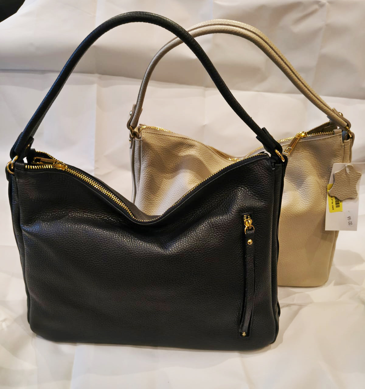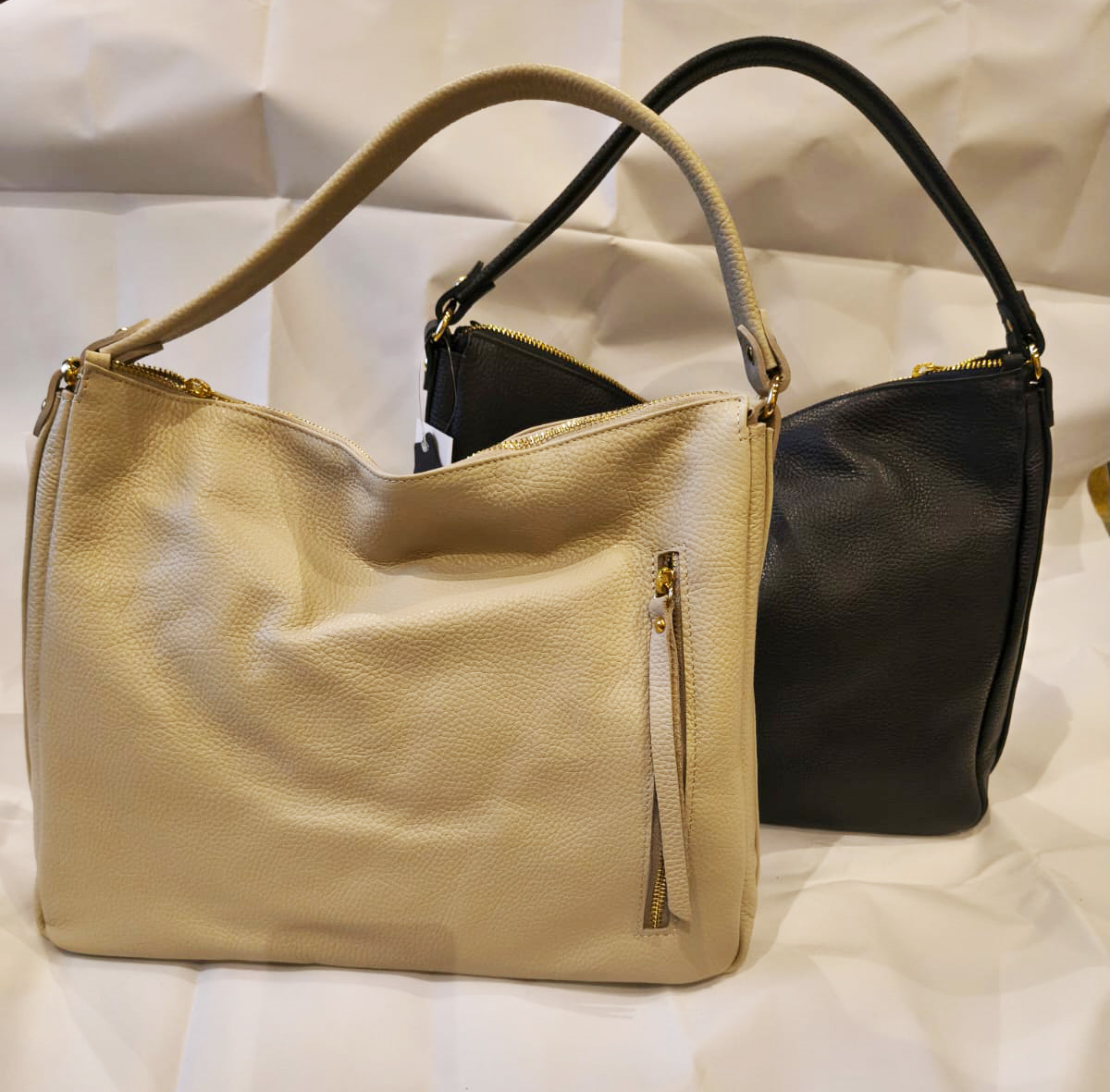 Capiente borsa a spalla con tracolla. Tasca interna e tasca esterna. Chiusura con zip