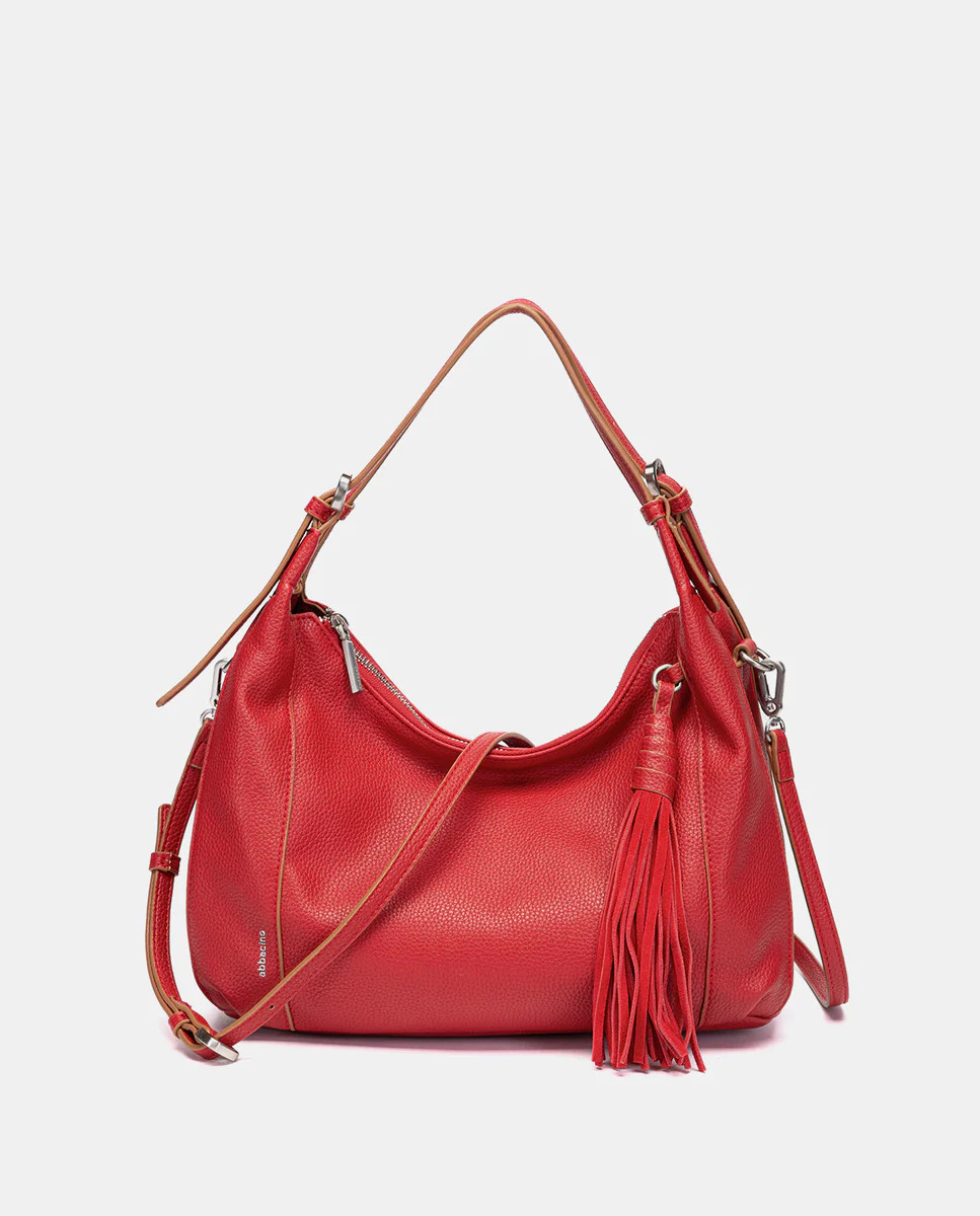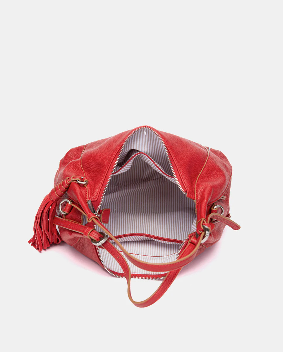 Borsa a tracolla da donna, realizzata con materiali riciclati, con una grande nappa laterale che fornisce un tocco sofisticato e femminile. Le sue caratteristiche principali sono: