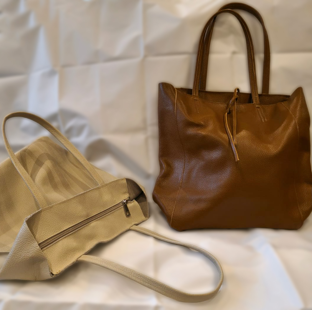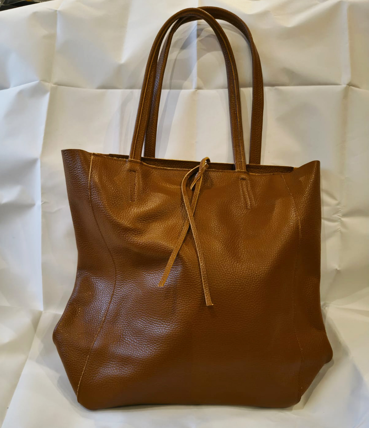 Sacca in morbida pelle, due manici, chiusura con laccio, comparto interno zippato