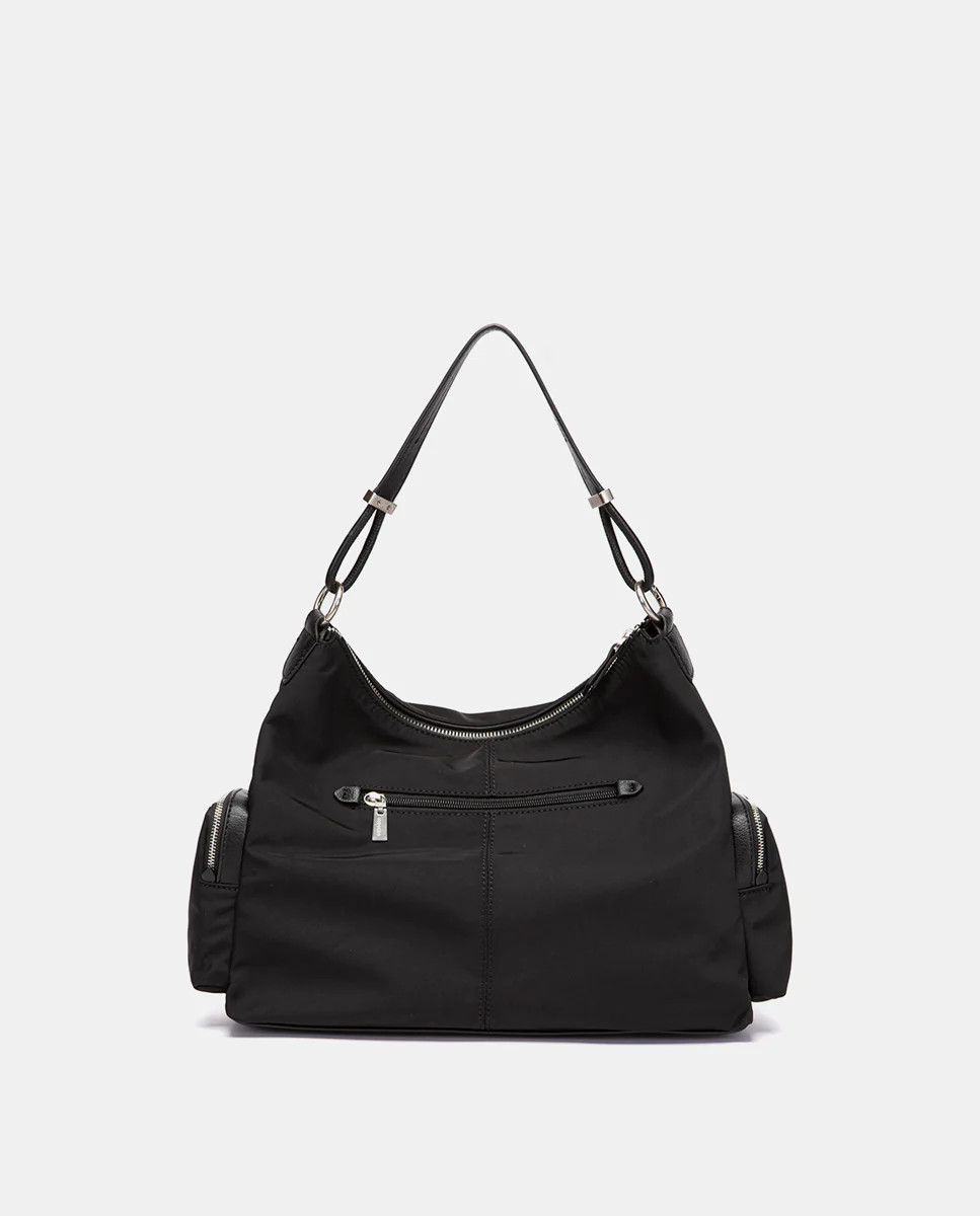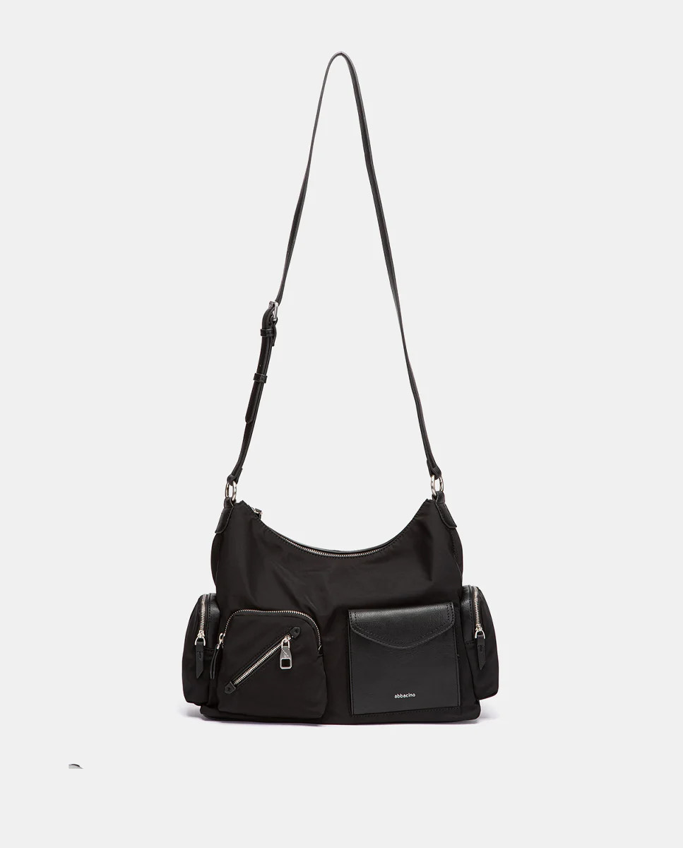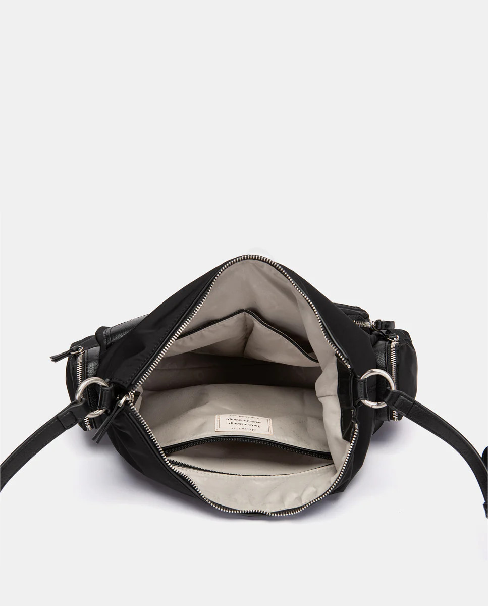 Borsa a tracolla in stile hobo realizzata con tessuti riciclati, che combinano due diverse texture e offrono grande funzionalità. Le sue caratteristiche principali sono: