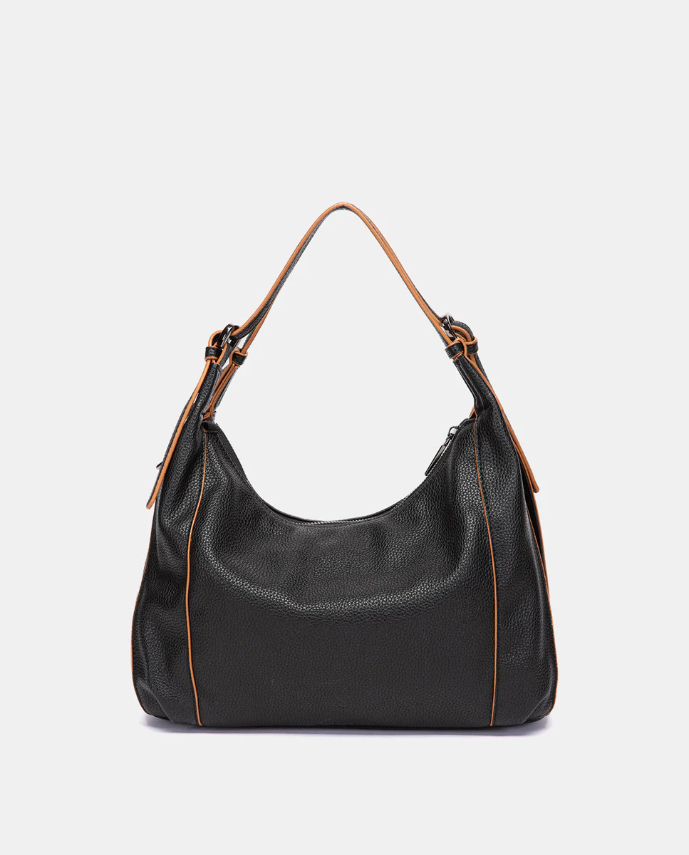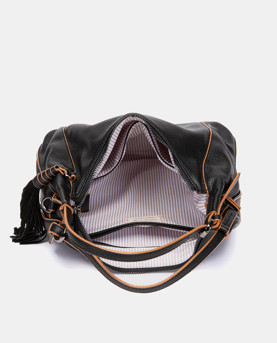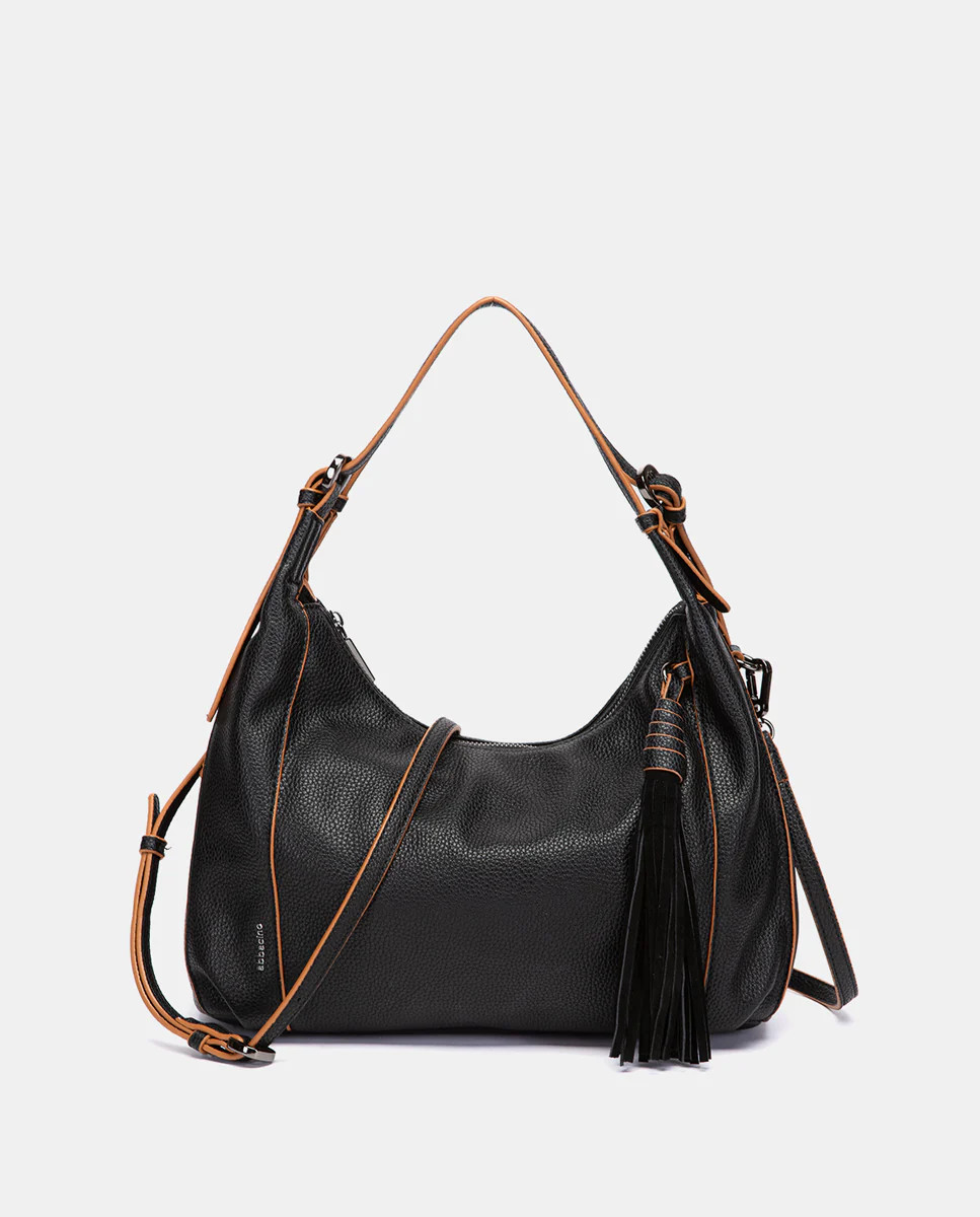 Borsa a tracolla da donna, realizzata con materiali riciclati, con una grande nappa laterale che fornisce un tocco sofisticato e femminile. Le sue caratteristiche principali sono: