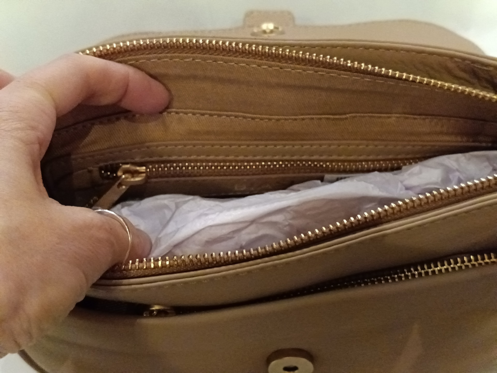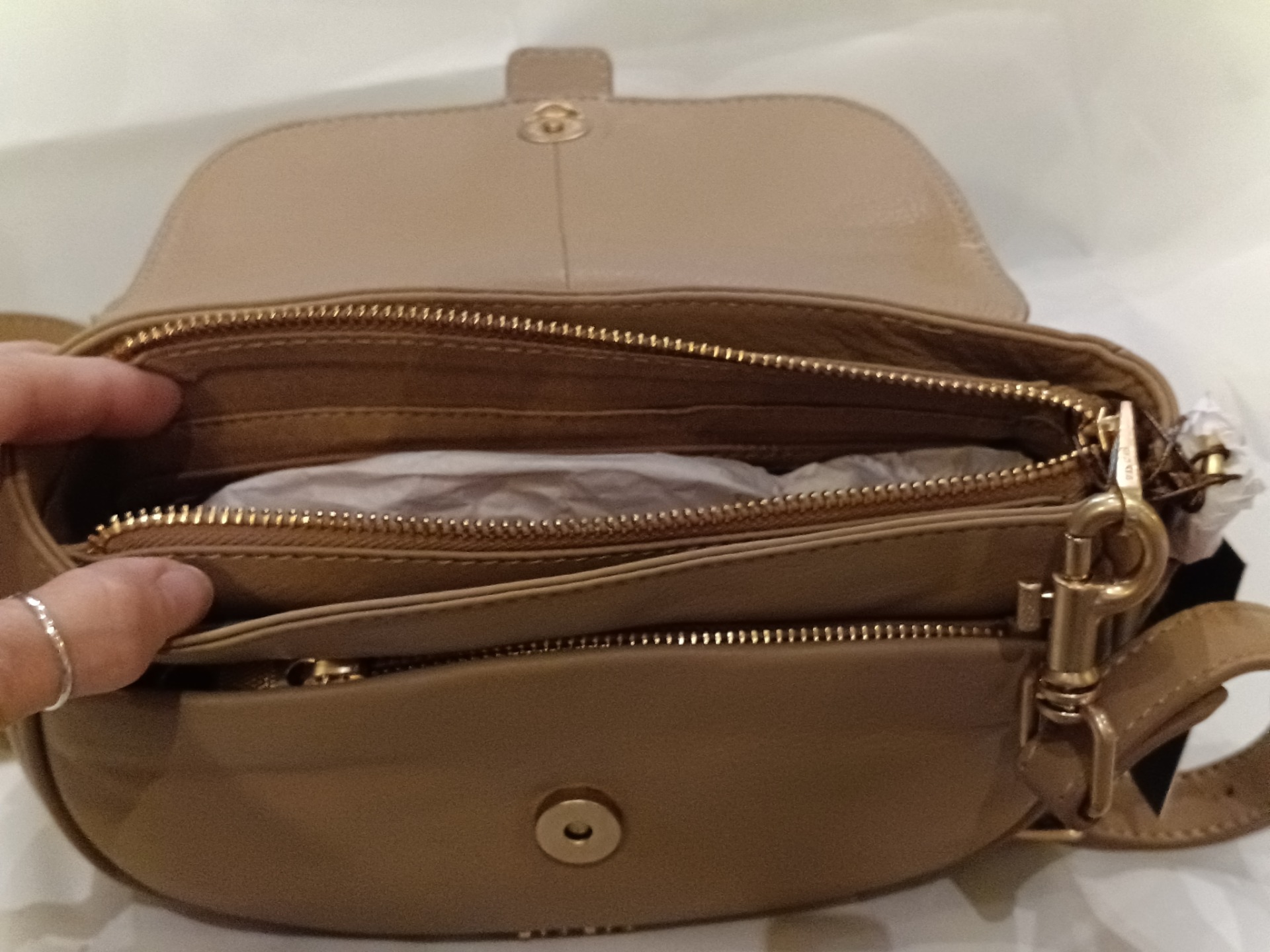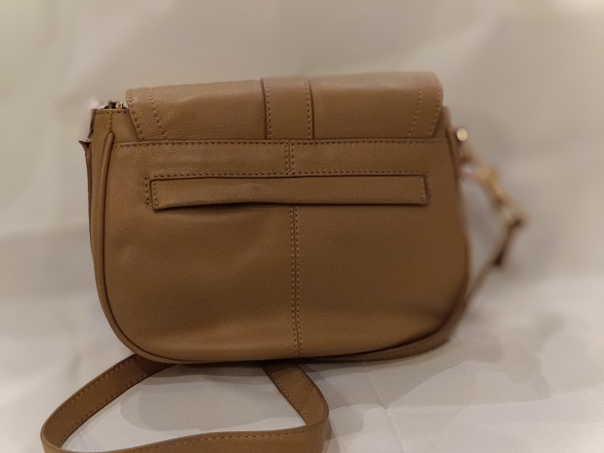 Borsa in pelle con patta e bottone.  Comparti separati e tasca zippata, tasca sul retro. Con tracolla regolabile