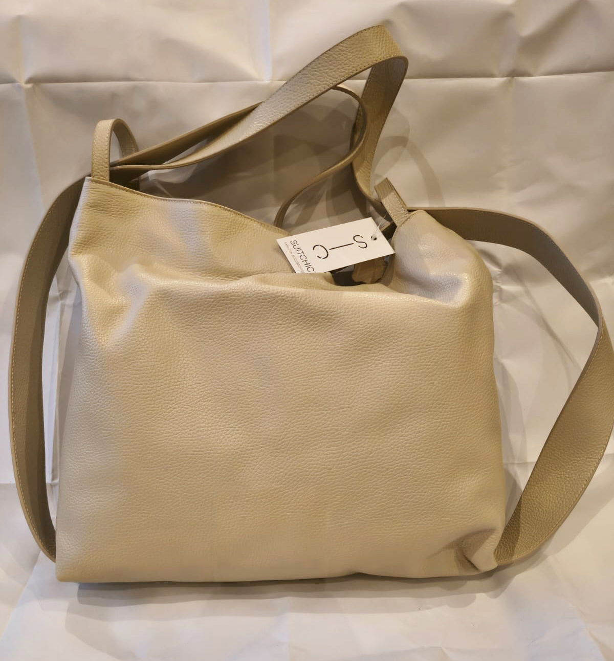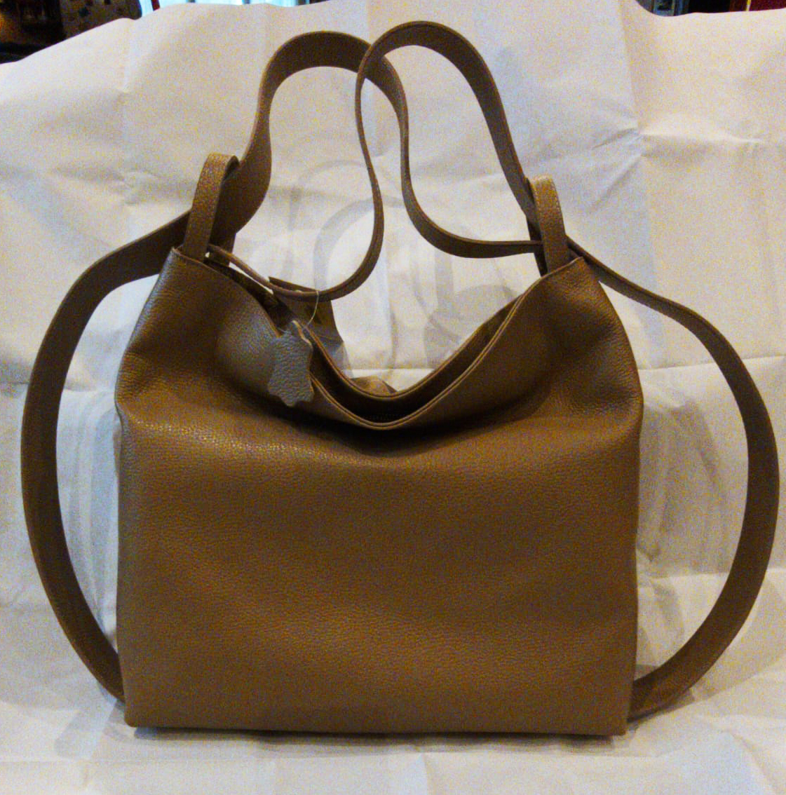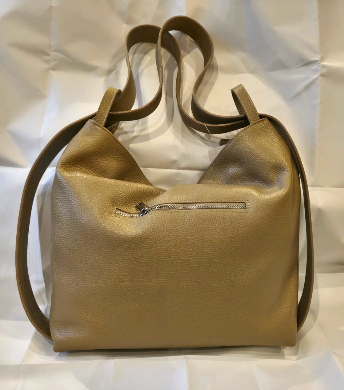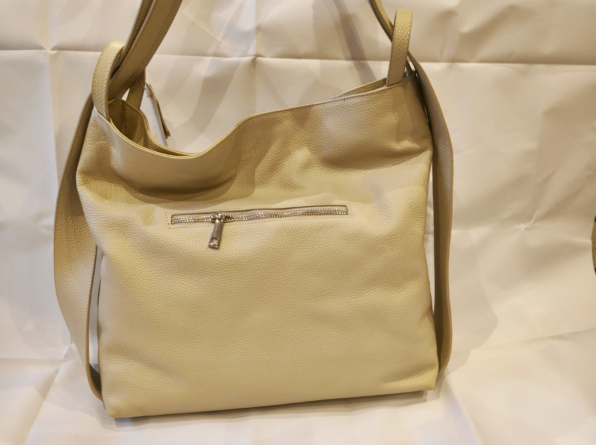 Capiente sacca da portare a spalla che si può rendere zaino facendo scorrere i due manici . Taschine interne