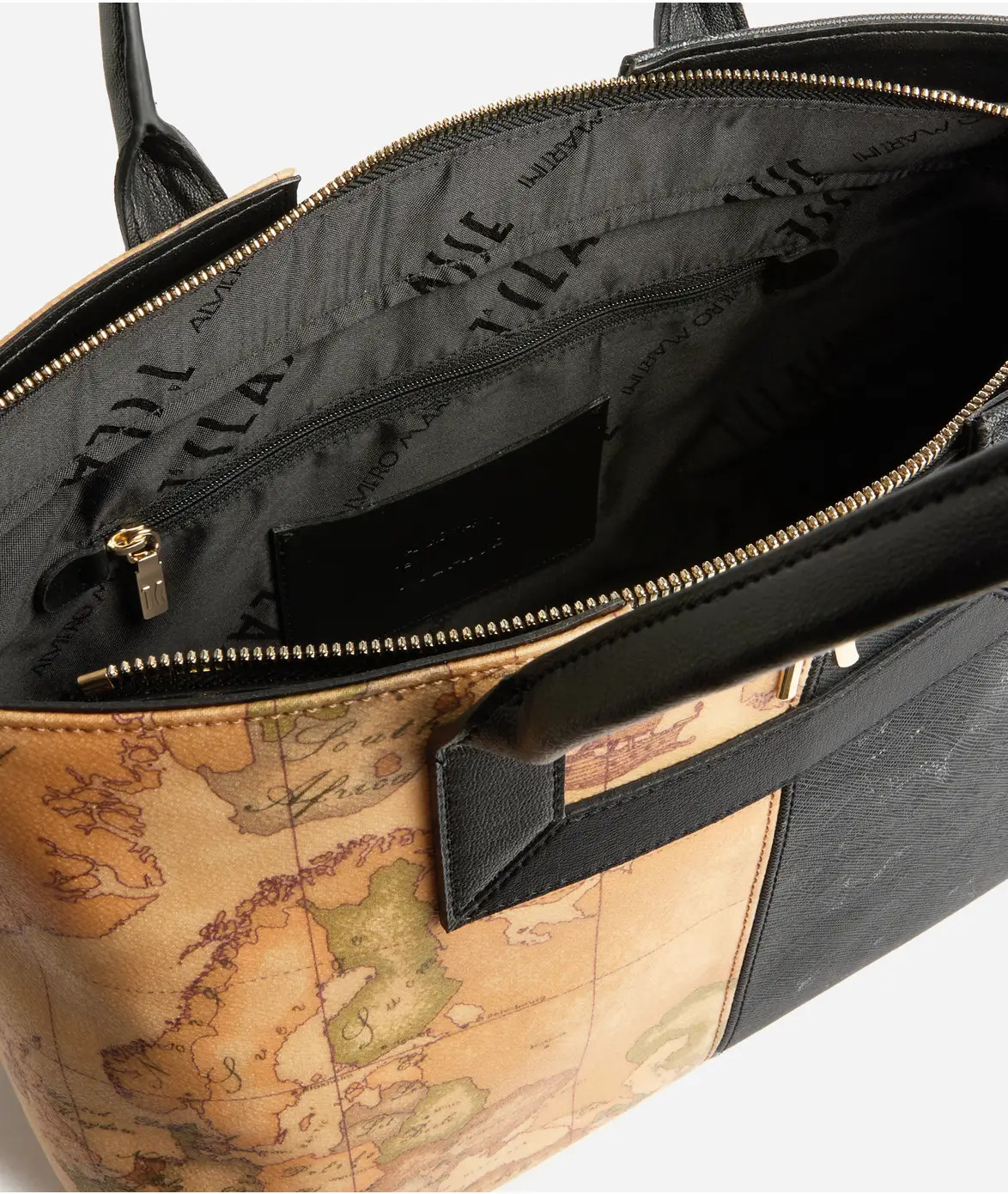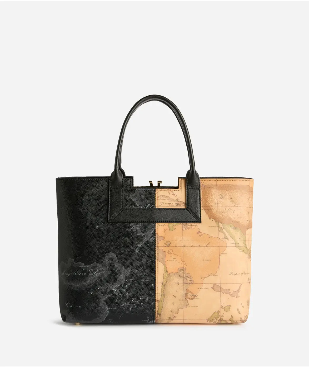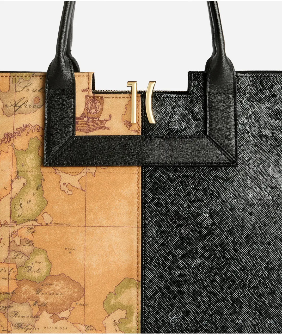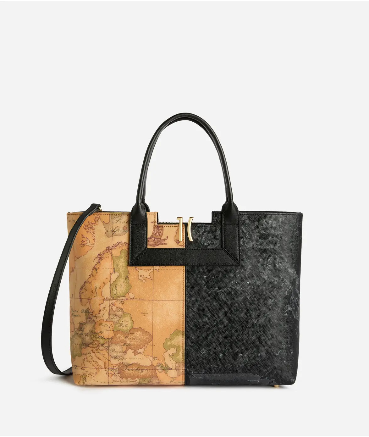 Metà in tessuto Geo Classic e metà in tessuto Geo Night, la borsa a mano Eclipse Geo mostra due volti dell'iconica mappa del brand in un elegante contrasto. Il dettaglio rettangolare in eco pelle nera armonizza il design, riflettendo la sagomatura in testa e incorniciando il logo 1C con finitura oro chiaro. Dotata di manici e tracolla regolabile e rimovibile per una doppia portabilità