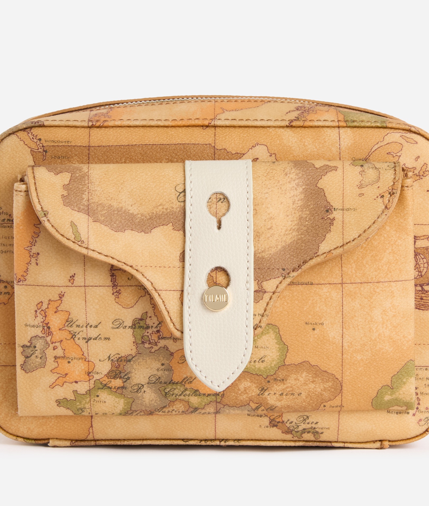 La tracollina reporter Escape Geo ha una linea squadrata e morbida, definita dall'amato tessuto Geo Classic. Il design è arricchito da una tasca frontale con patta sagomata, attraversata nel centro dal listino in pelle granata fine nei colori di Collezione: in corrispondenza della chiusura con magnete, il listino accoglie la borchietta logata 1ᴬ Classe con finitura oro chiaro. Si abbina all'inserto la tracolla regolabile in pelle granata fine.