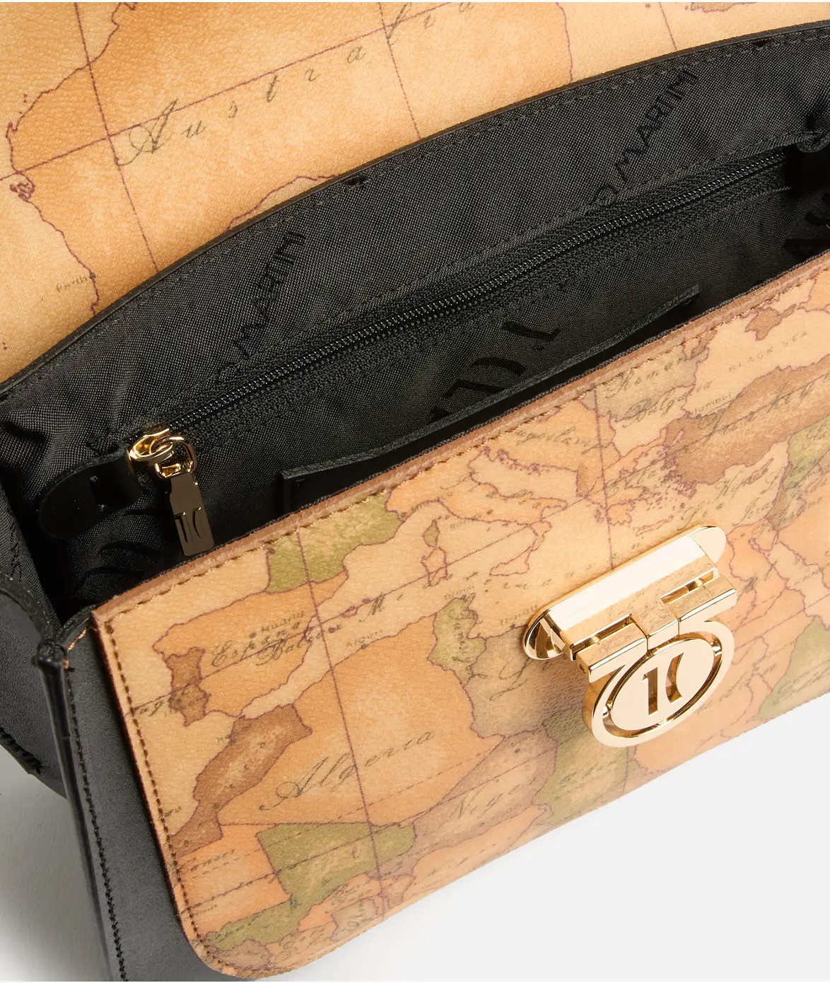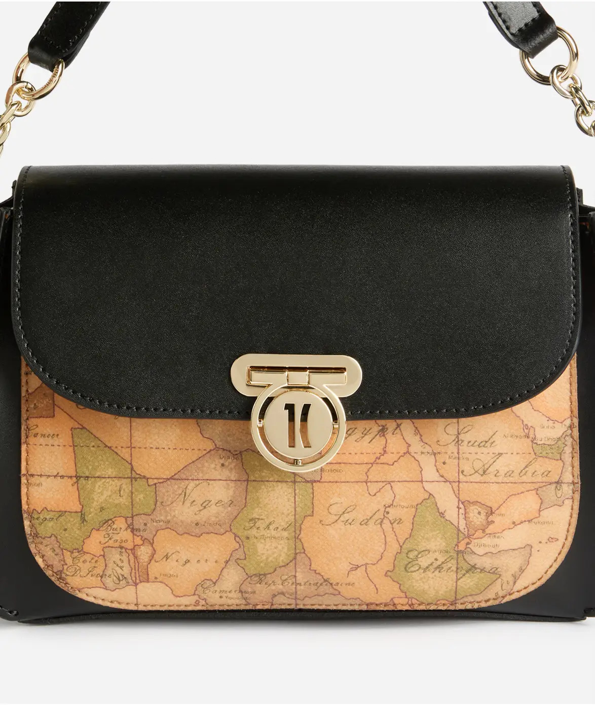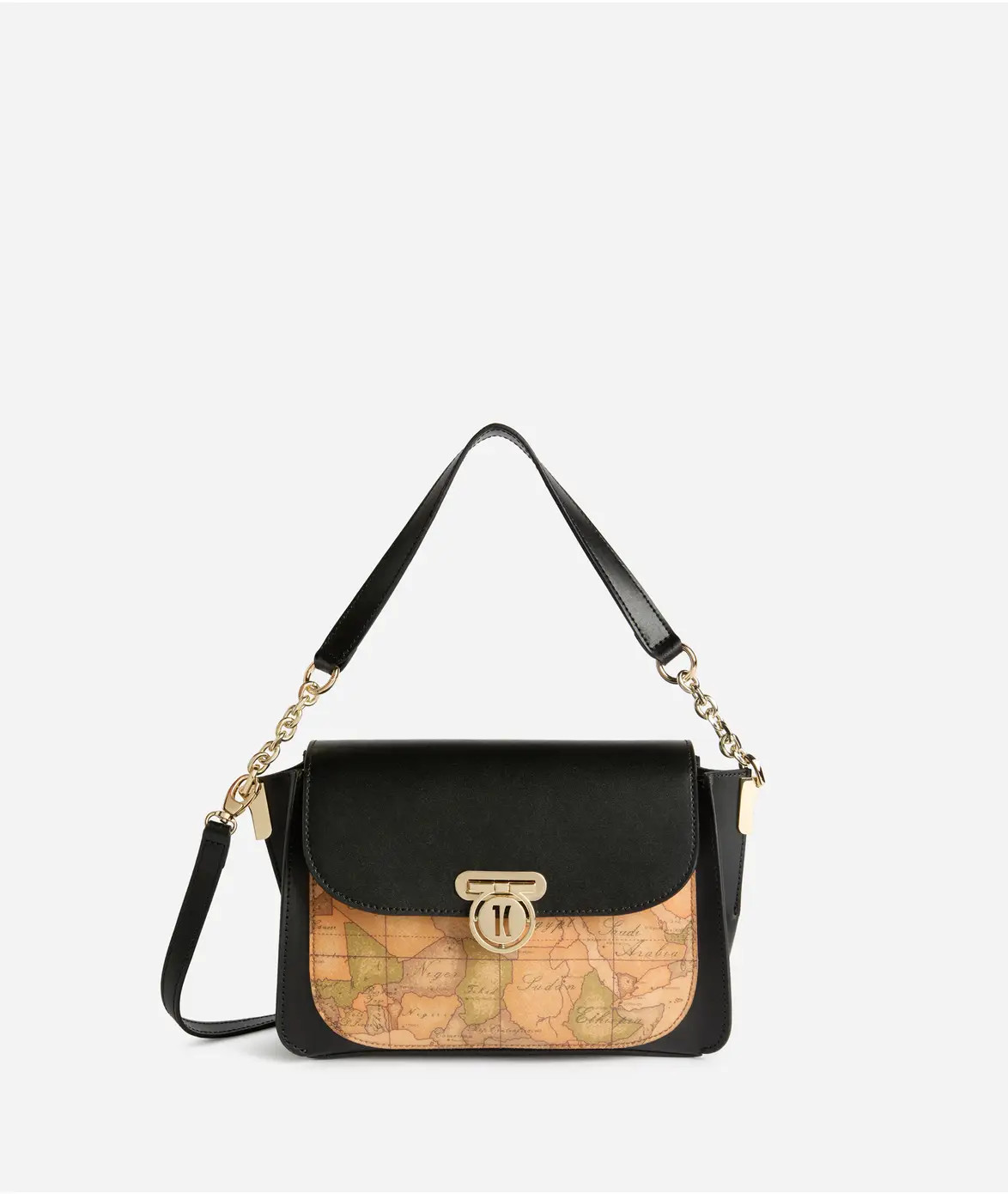 Compatta e strutturata, la borsa a mano con patta Geo Secret Lock è realizzata in pelle liscia abbinata al maxi inserto frontale in tessuto Geo Classic. A dare il nome alla Linea è la chiusura a incastro con medaglietta logata 1C, che si solleva e scivola attraverso la fessura per aprire la patta. Il manico in pelle con inserto in catena permette di portare la borsa a mano o a spalla, mentre la tracolla regolabile e rimovibile consente anche la portabilità crossbody.