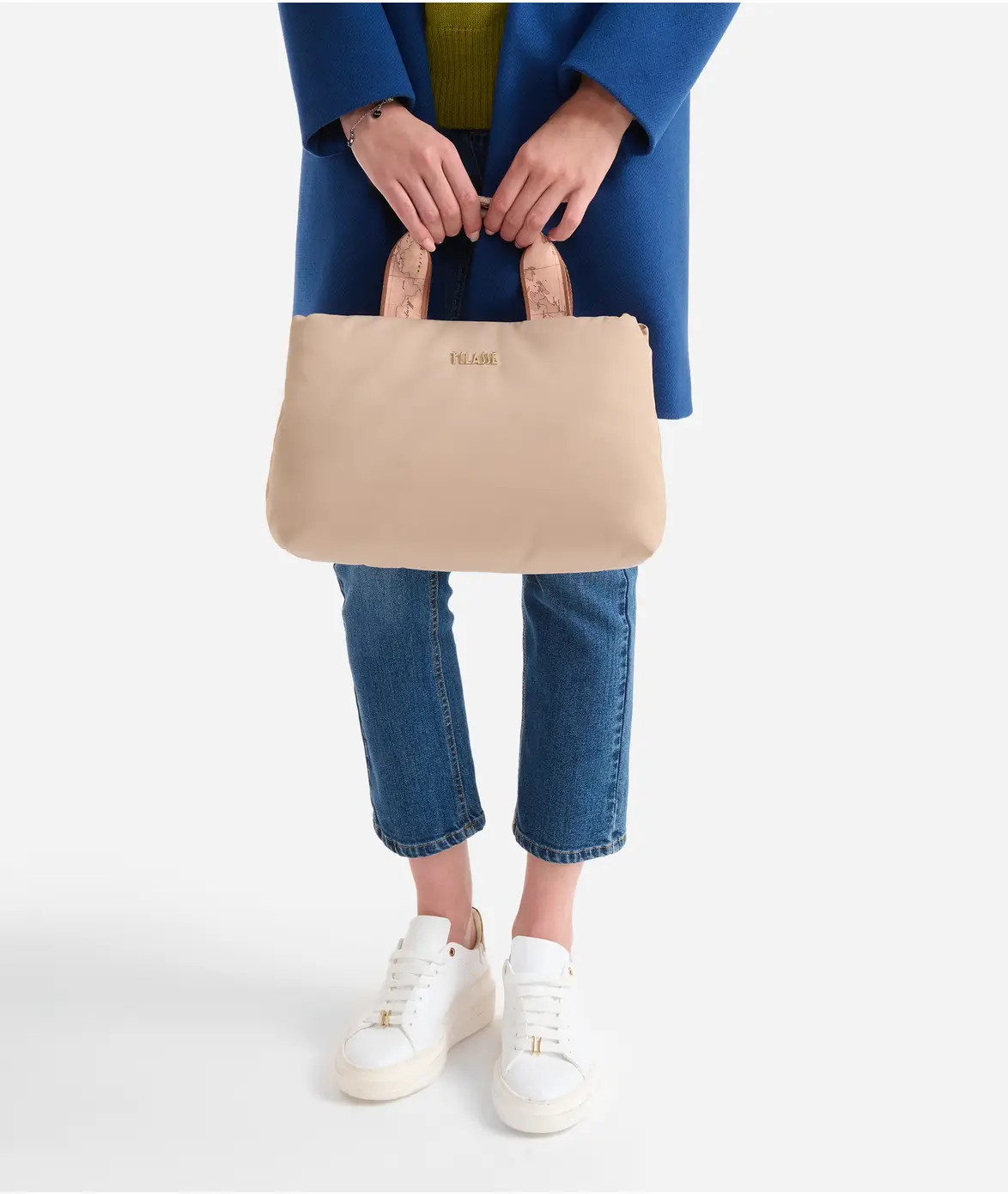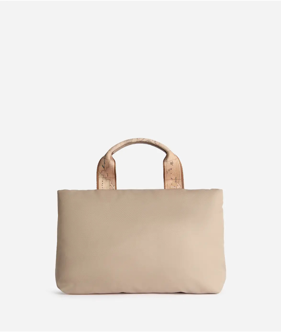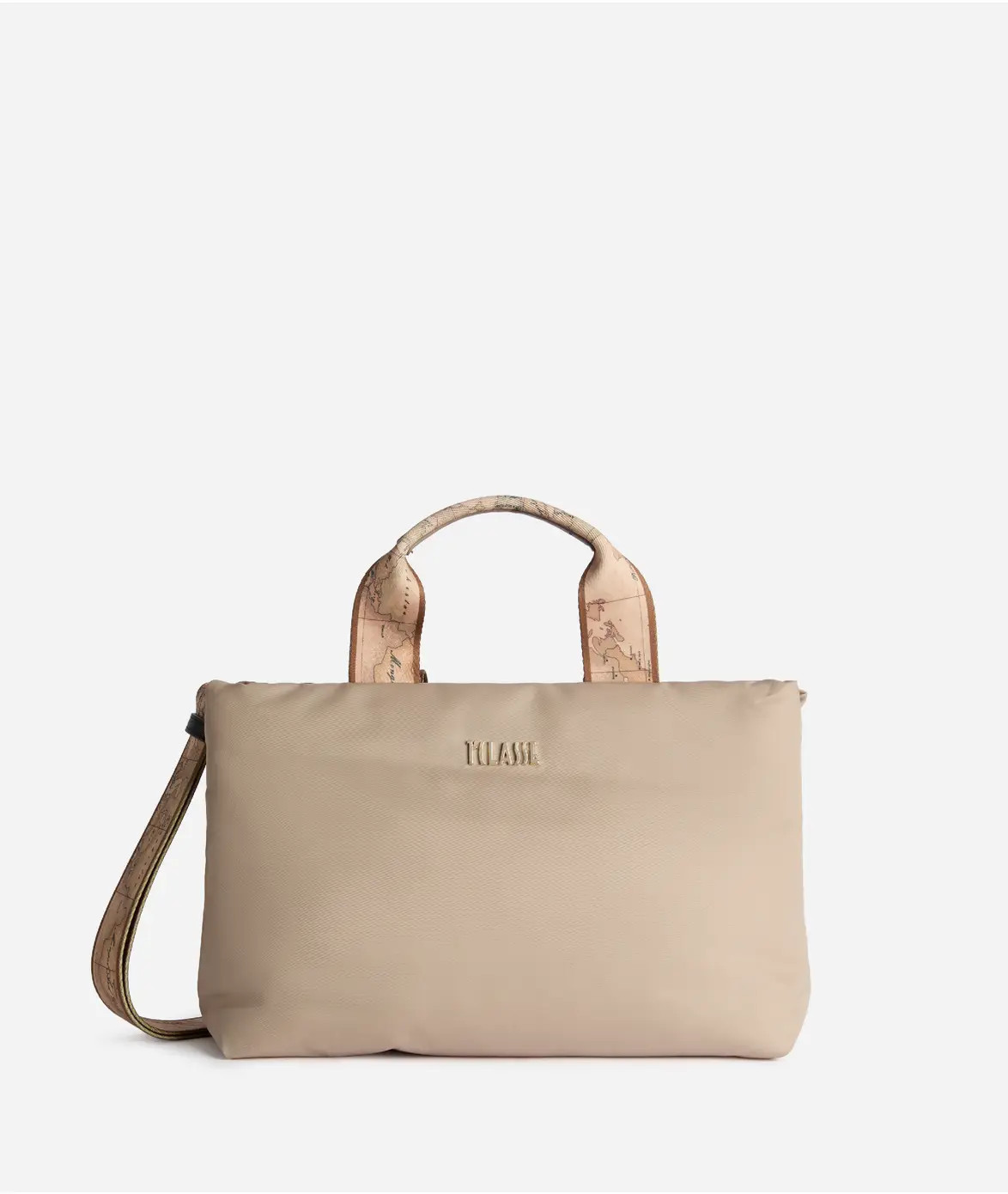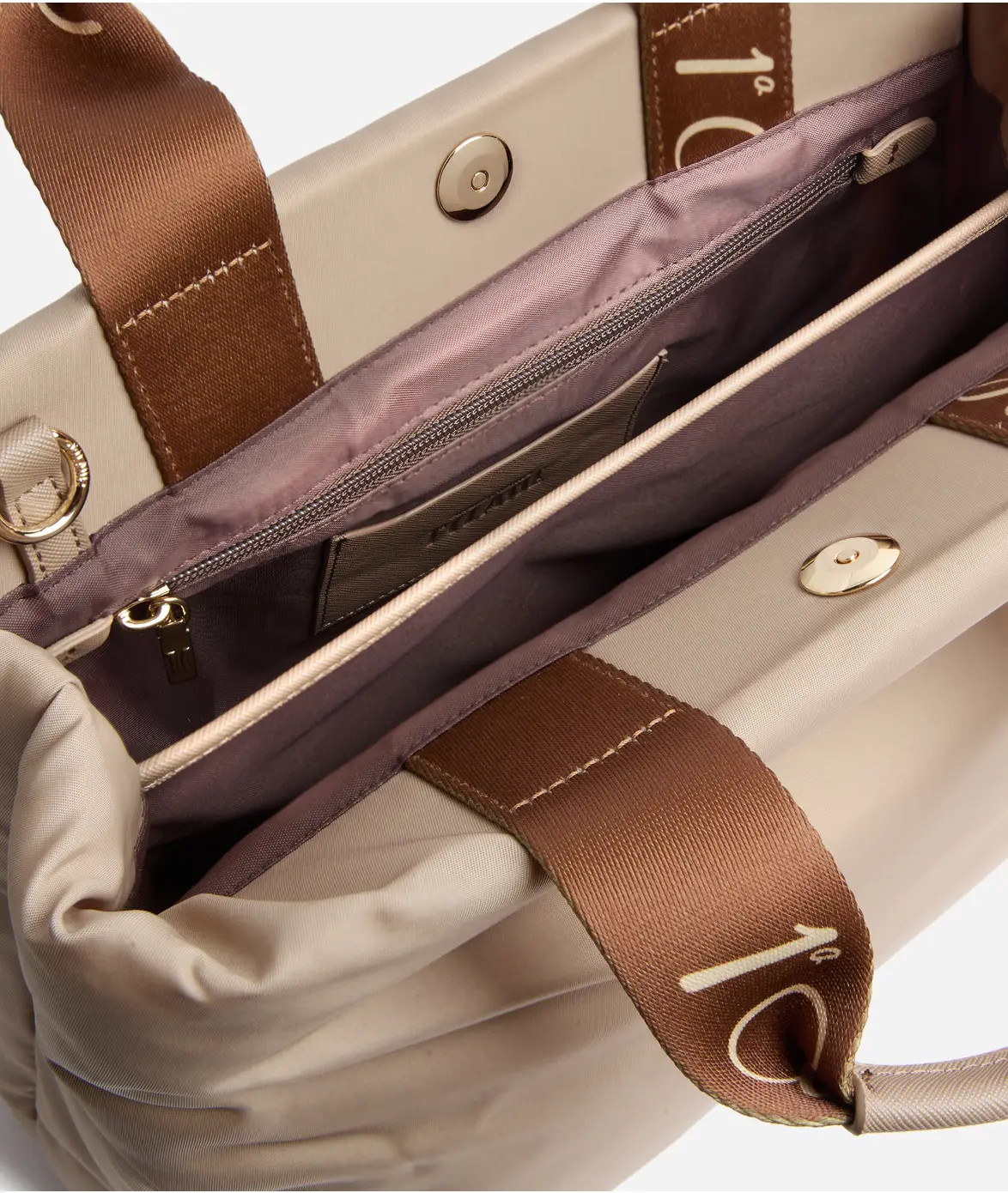 La Collezione 2025-26 regala un volto inaspettato al nylon riciclato ecosostenibile: la borsa a mano Puffy Nylon ha una costruzione imbottita che la rende morbida e attuale, con manici in nastro ripiegati con inserti in tessuto saffiano per una portabilità confortevole. La chiusura con magnete svela un interno molto capiente, con due scomparti e più tasche interne, mentre la tracolla regolabile e rimovibile sfoggia la stampa Geo Classic su un lato e il logo 1ᴬ Classe in corsivo sull'altro