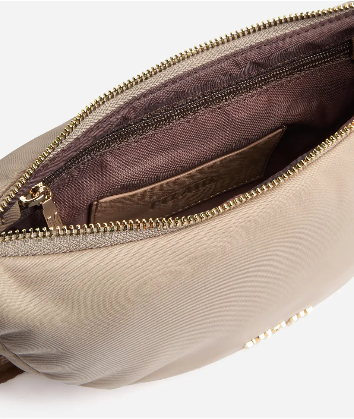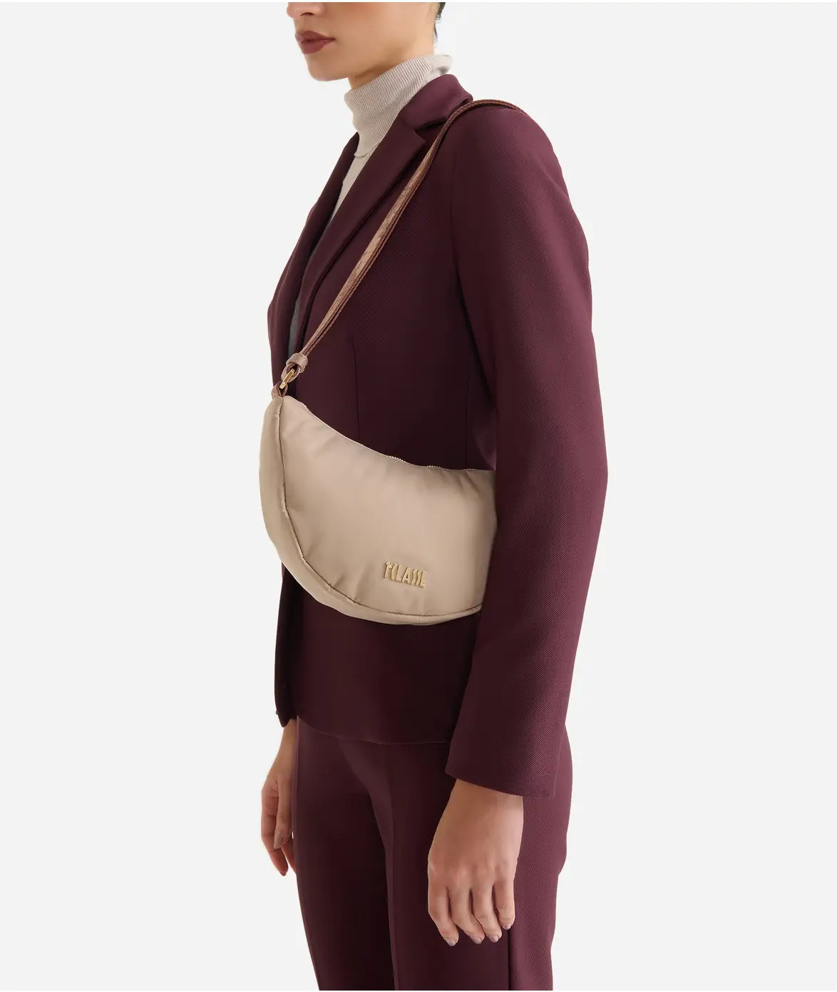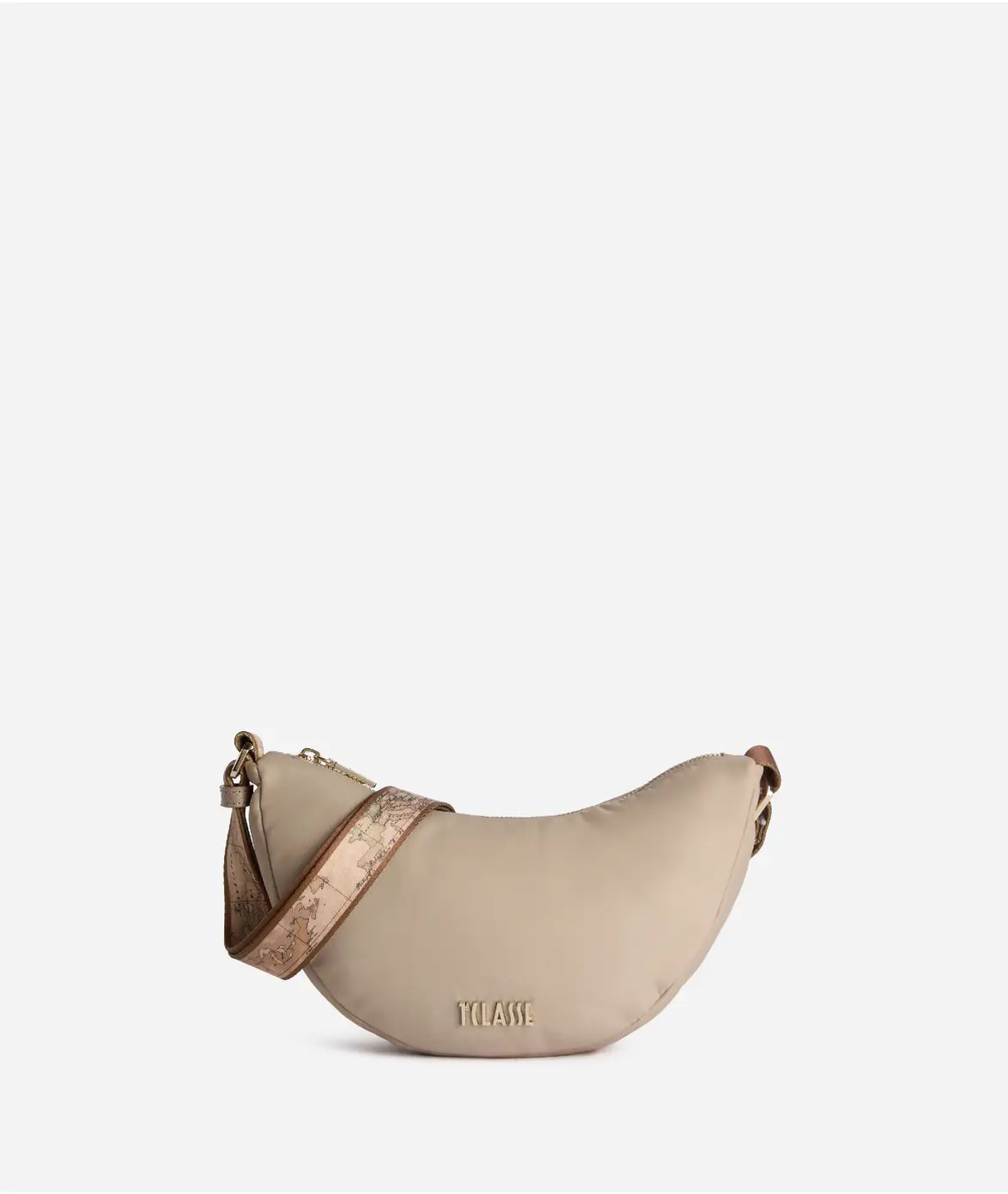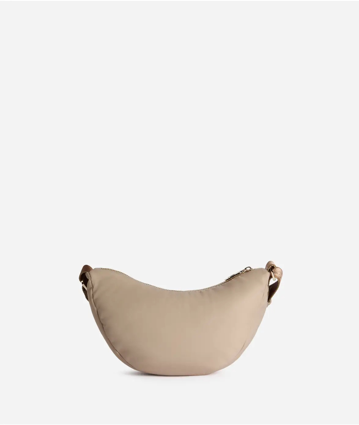 Novità assoluta in Collezione, il nylon riciclato imbottito regala un animo green e distintivo alla mini mezzaluna Puffy Nylon: morbida e leggera, ha un animo sporty-chic grazie alla tracolla regolabile in nastro stampa Geo Classic, rifinita dal logo in corsivo sul lato opposto