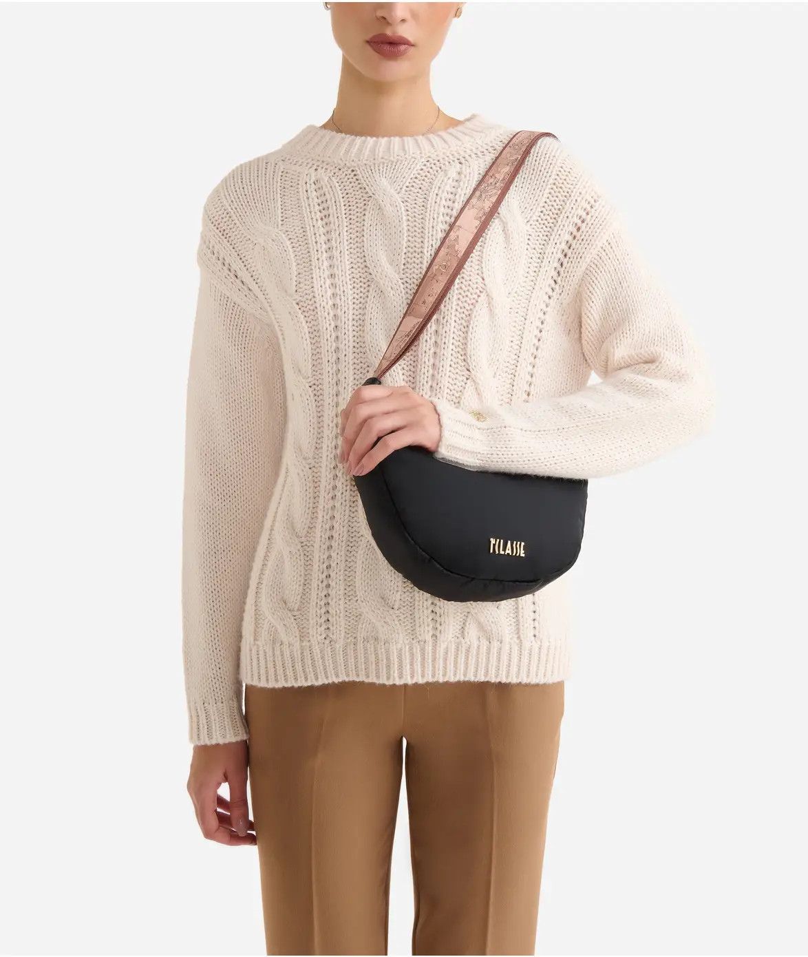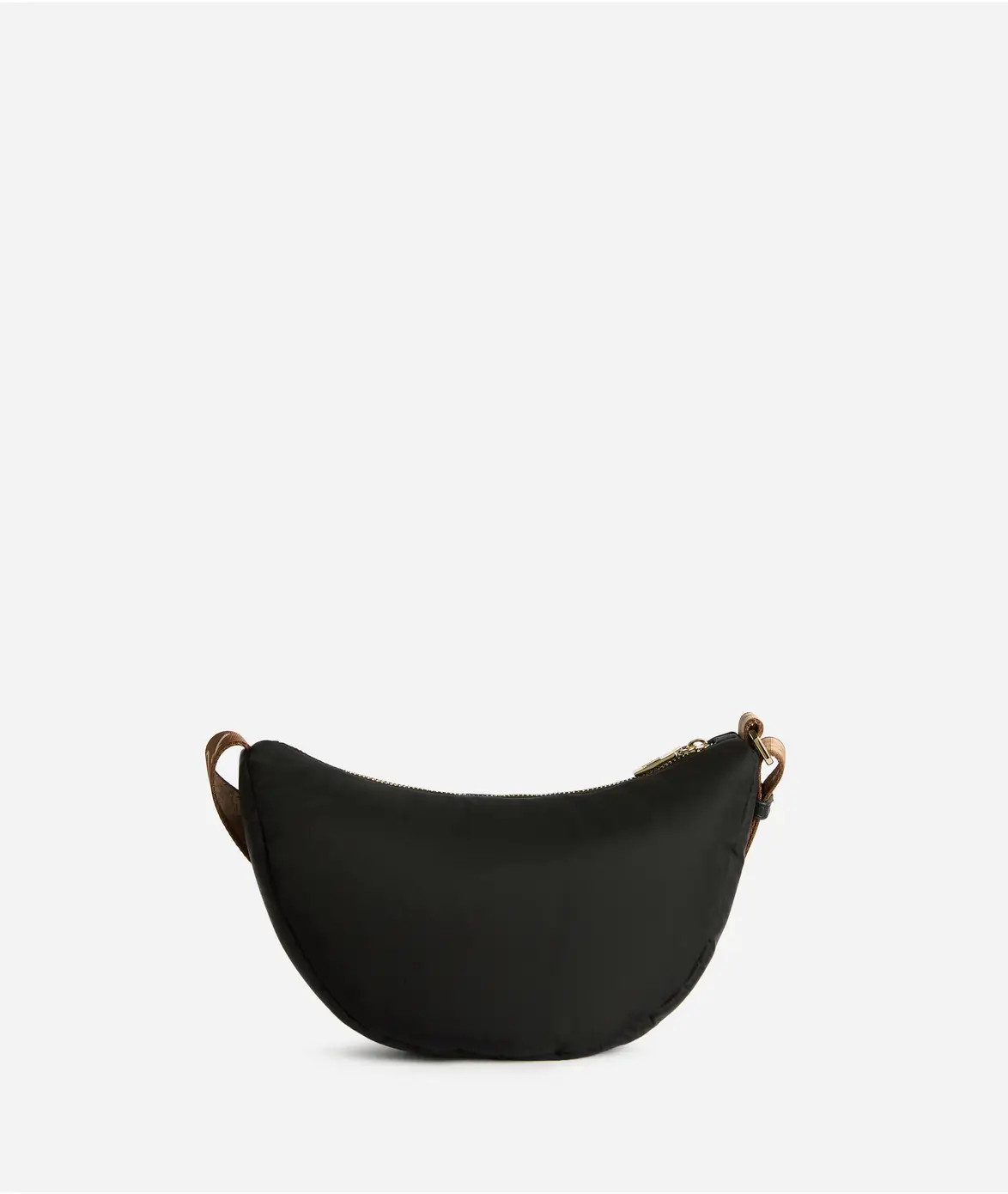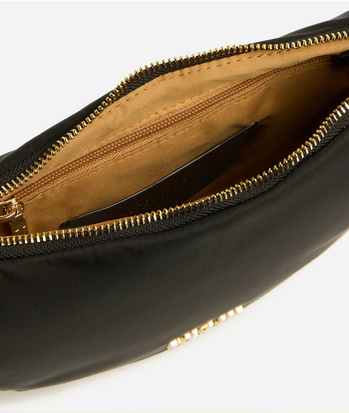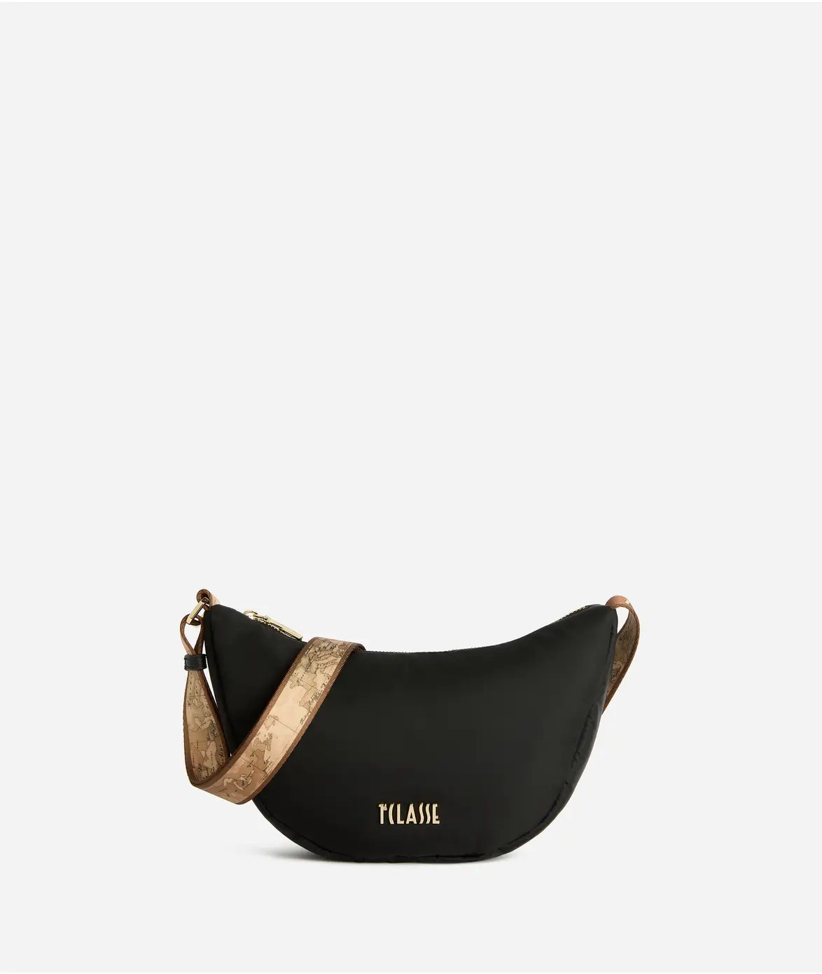 Novità assoluta in Collezione, il nylon riciclato imbottito regala un animo green e distintivo alla mini mezzaluna Puffy Nylon: morbida e leggera, ha un animo sporty-chic grazie alla tracolla regolabile in nastro stampa Geo Classic, rifinita dal logo in corsivo sul lato opposto