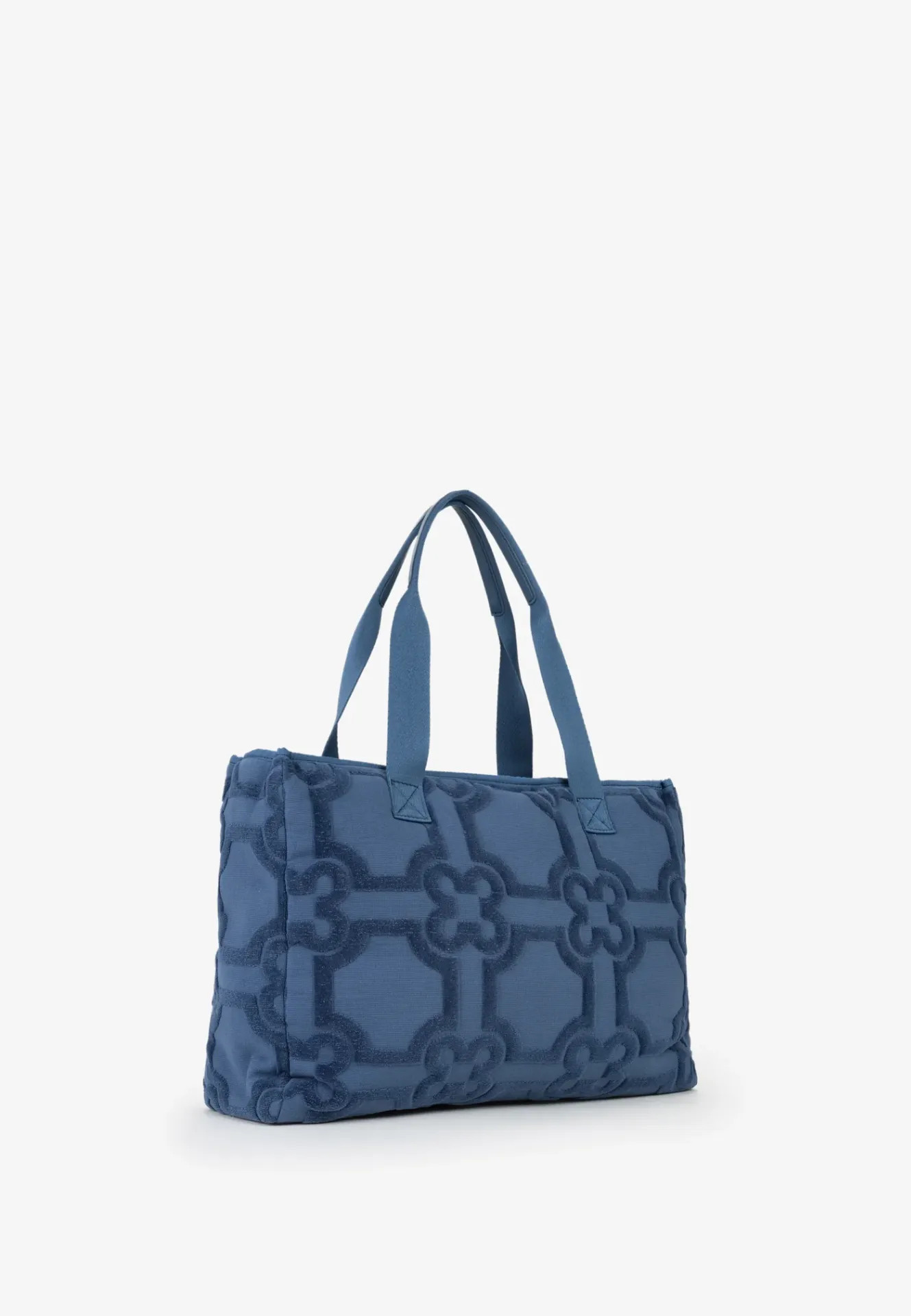 shopping bag in spugna con all over v73 in rilievo, personalizzata con maxi etichetta tessita in tono.