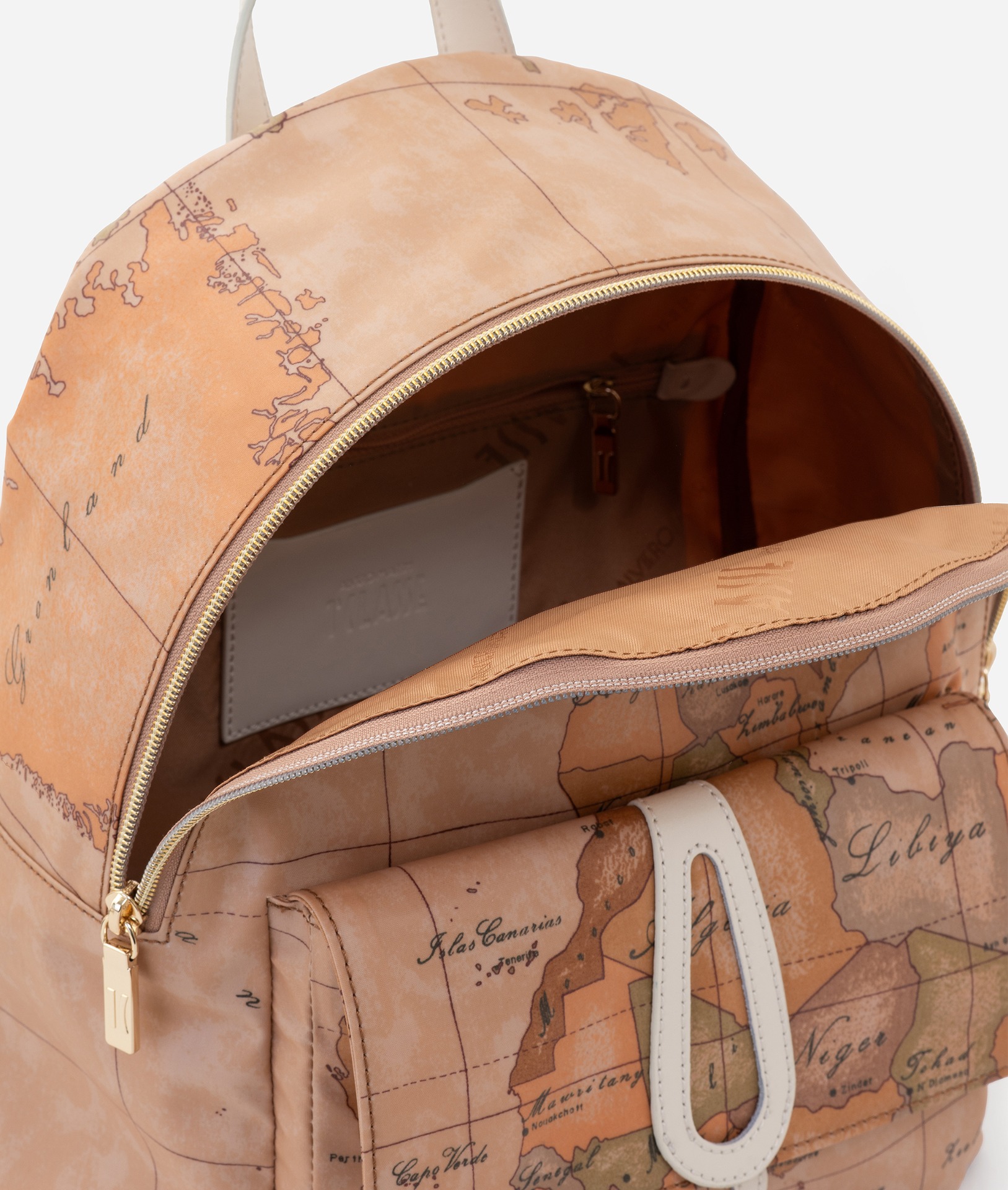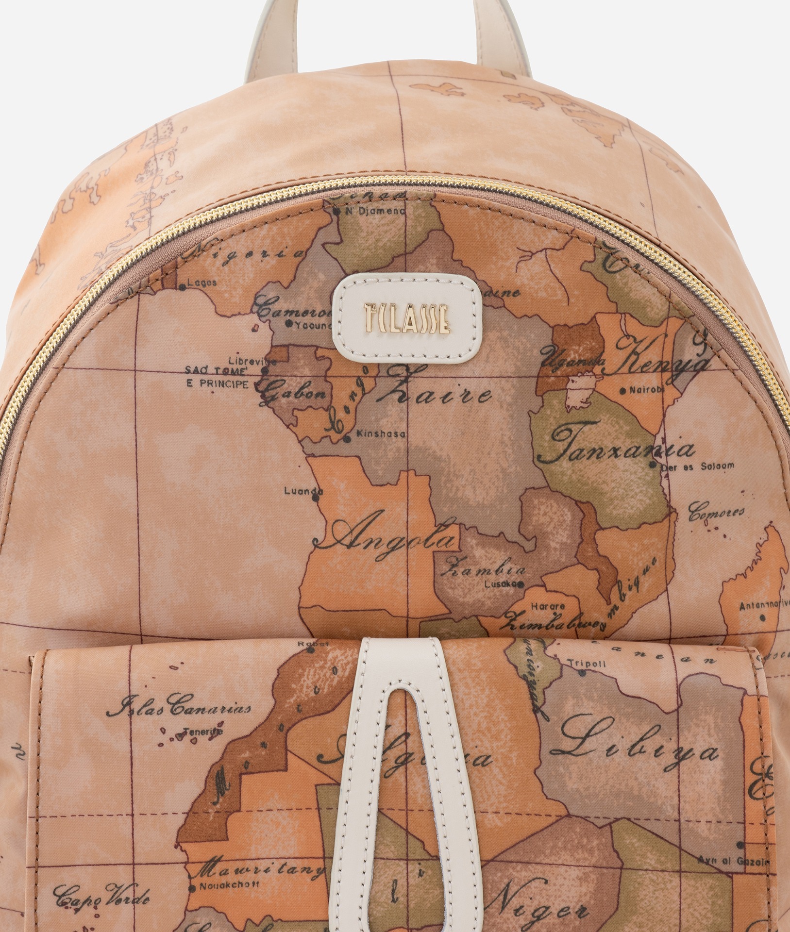 Lo zaino Soft Petals unisce lo spirito active del tessuto soft stampa Geo Classic con l'estetica della Collezione Primavera/Estate 2026. L'inserto in pelle liscia sulla tasca frontale interpreta le linee affusolate delle foglie di eucalipto Australiano, mentre il logo 1ᴬ Classe è incorniciato dal patch in pelle liscia. Le tre tasche interne mantengono ben organizzati tutti gli oggetti essenziali per una giornata in città: funzionale e impermeabile, è l'alleato vincente anche nelle giornate di mezza stagione, ideale da abbinare a giacche antivento e sneaker di Collezione.