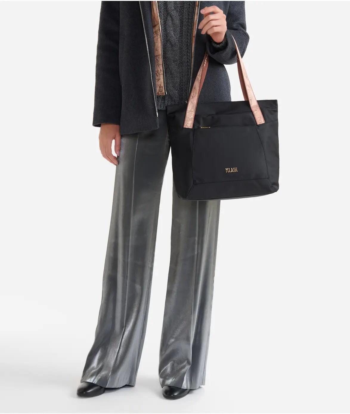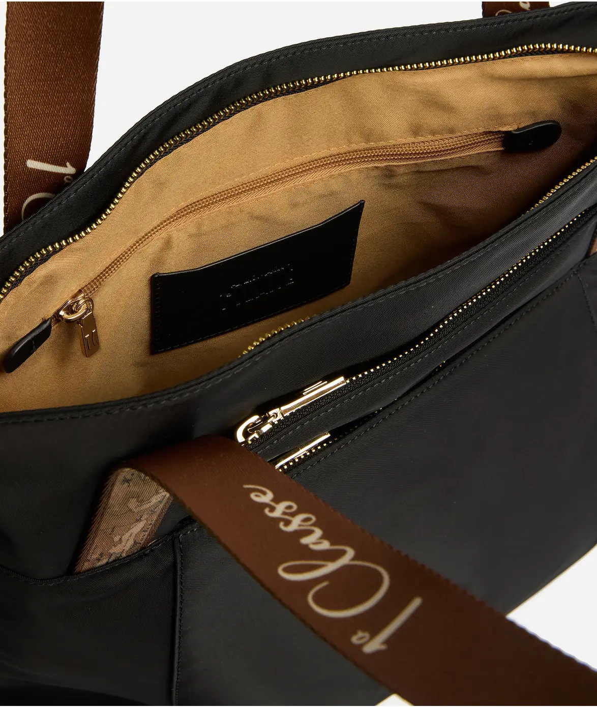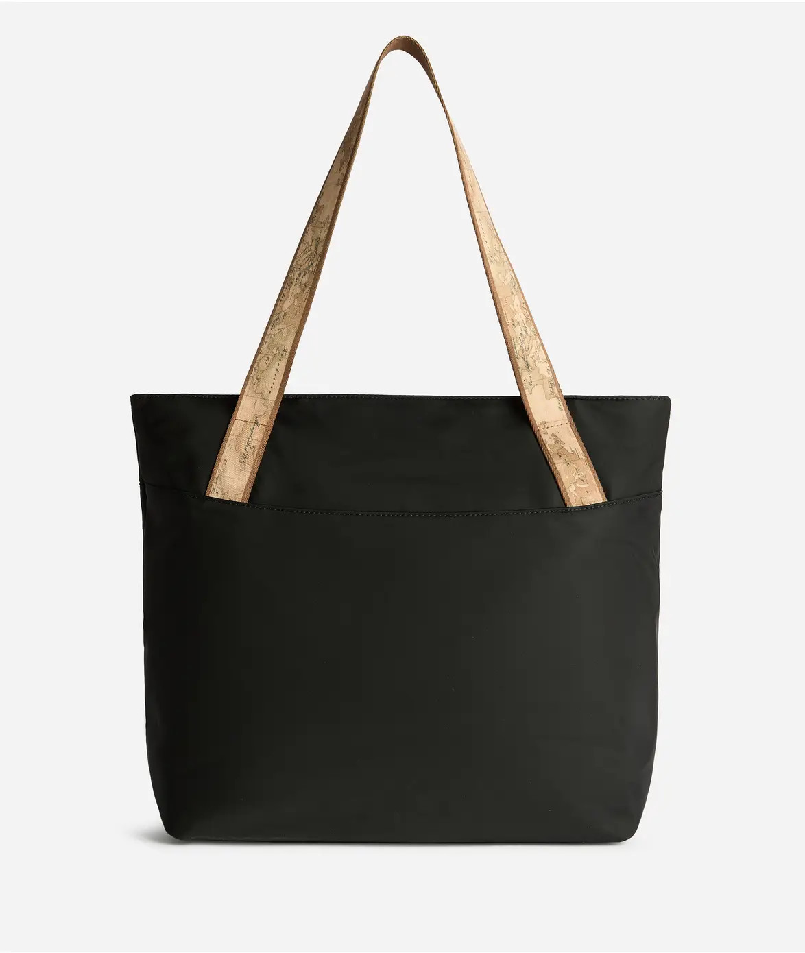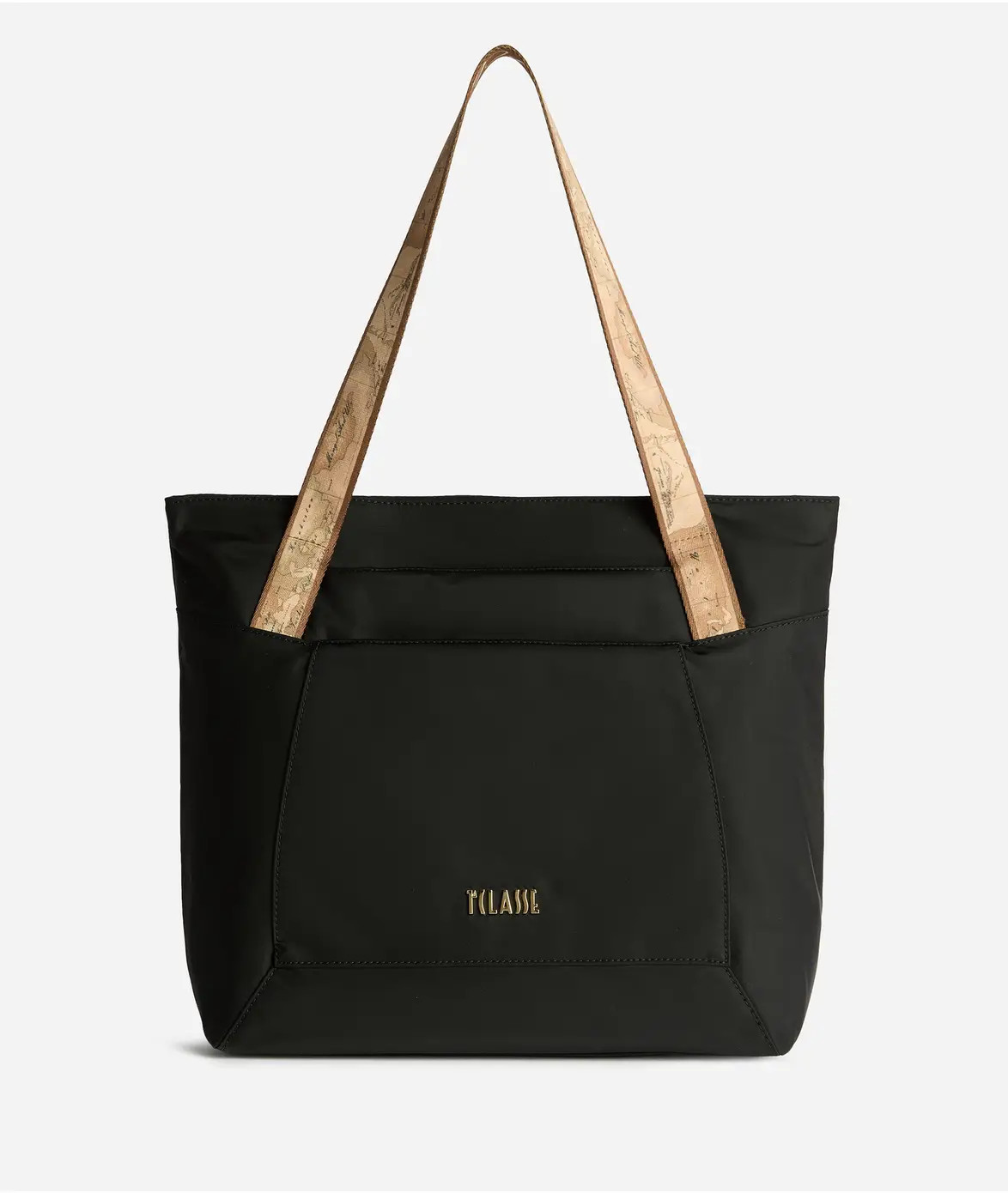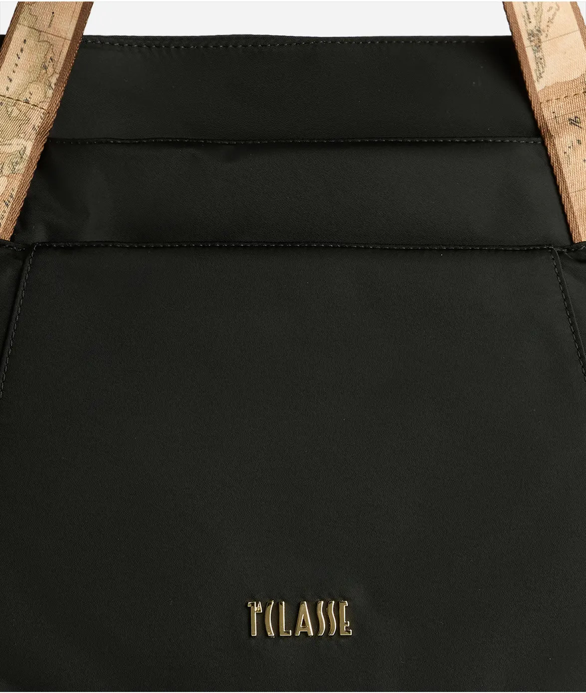 La borsa shopping in nylon riciclato rinnova il suo look dotandosi di due tasche frontali e declinandosi nelle tonalità della Linea Stormy Nylon, ispirata ai suggestivi paesaggi scozzesi in inverno. I manici in nastro con stampa Geo Classic e logo in corsivo sul retro aggiungono un punto luce che rende inconfondibile il modello, completato dal maxi logo 1ᴬ Classe in oro chiaro. Il volume morbido e capiente si completa di ulteriori tasche interne per un'attitude funzionale, che combina uno spirito green con uno stile sporty-chic.