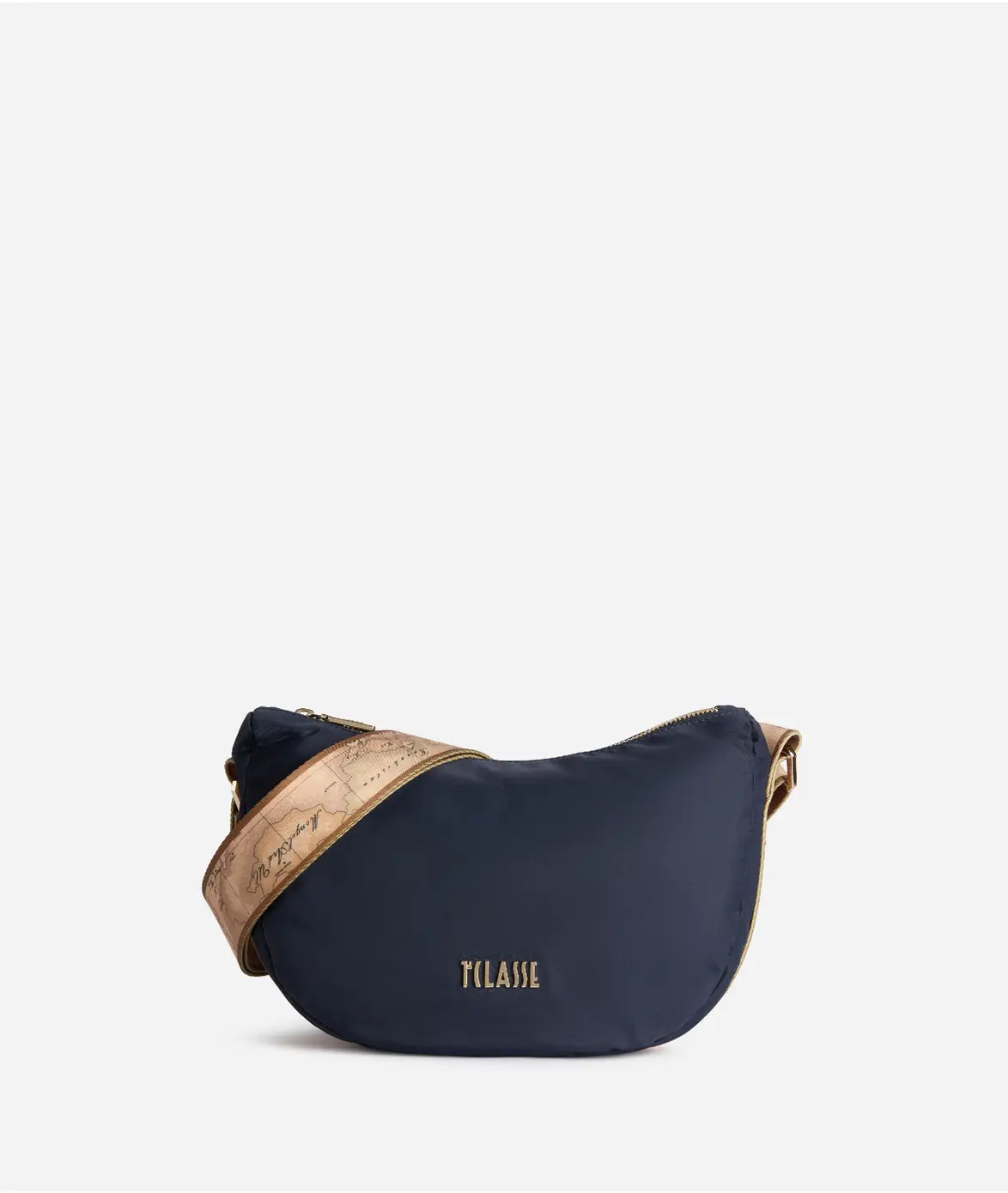 La tracollina a mezzaluna piccola Stormy Nylon interpreta il nylon riciclato ecosostenibile nelle tonalità intense del cielo invernale scozzese, illuminate dal maxi logo 1ᴬ Classe in oro chiaro. Il logo del brand si fa notare anche sulla tracolla regolabile in nastro, con lato opposto in stampa Geo Classic, ridefinendo l'attitude sportiva secondo i codici del brand. Provvista di più tasche interne, è morbida e funzionale, perfetta per uno stile urban distintivo e attento all'ambiente.