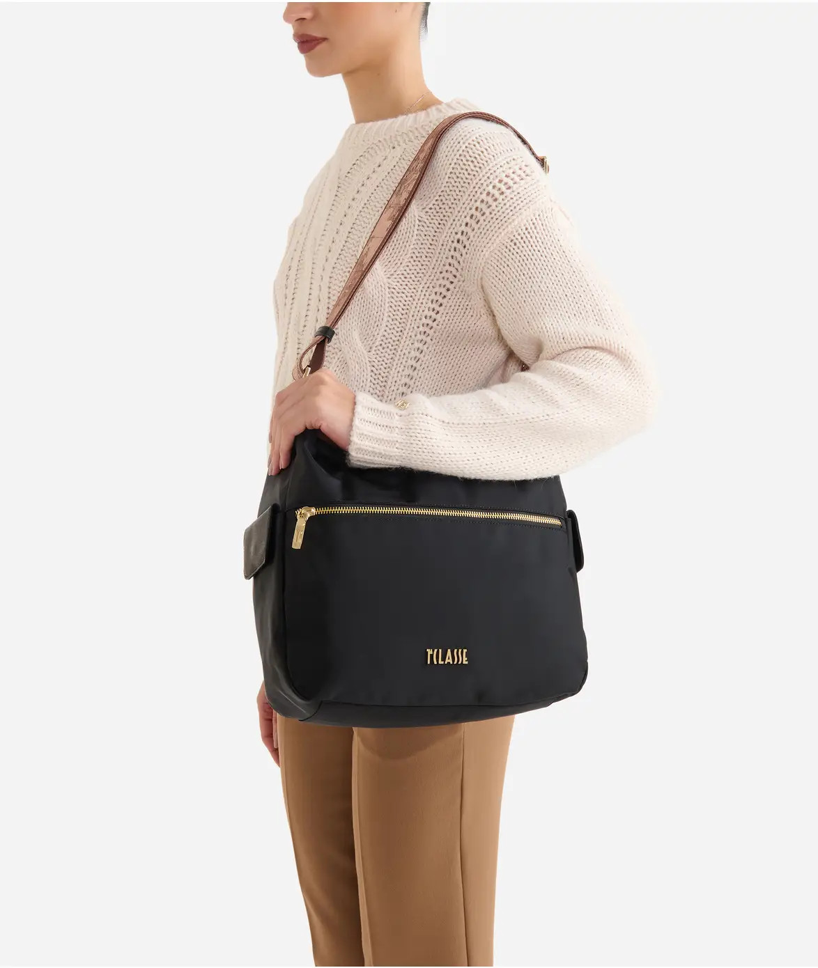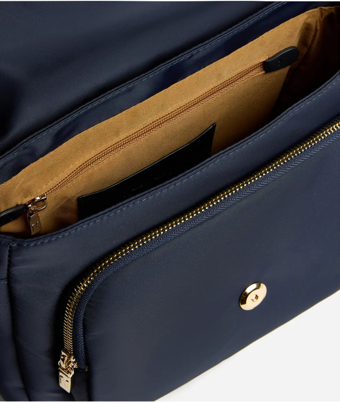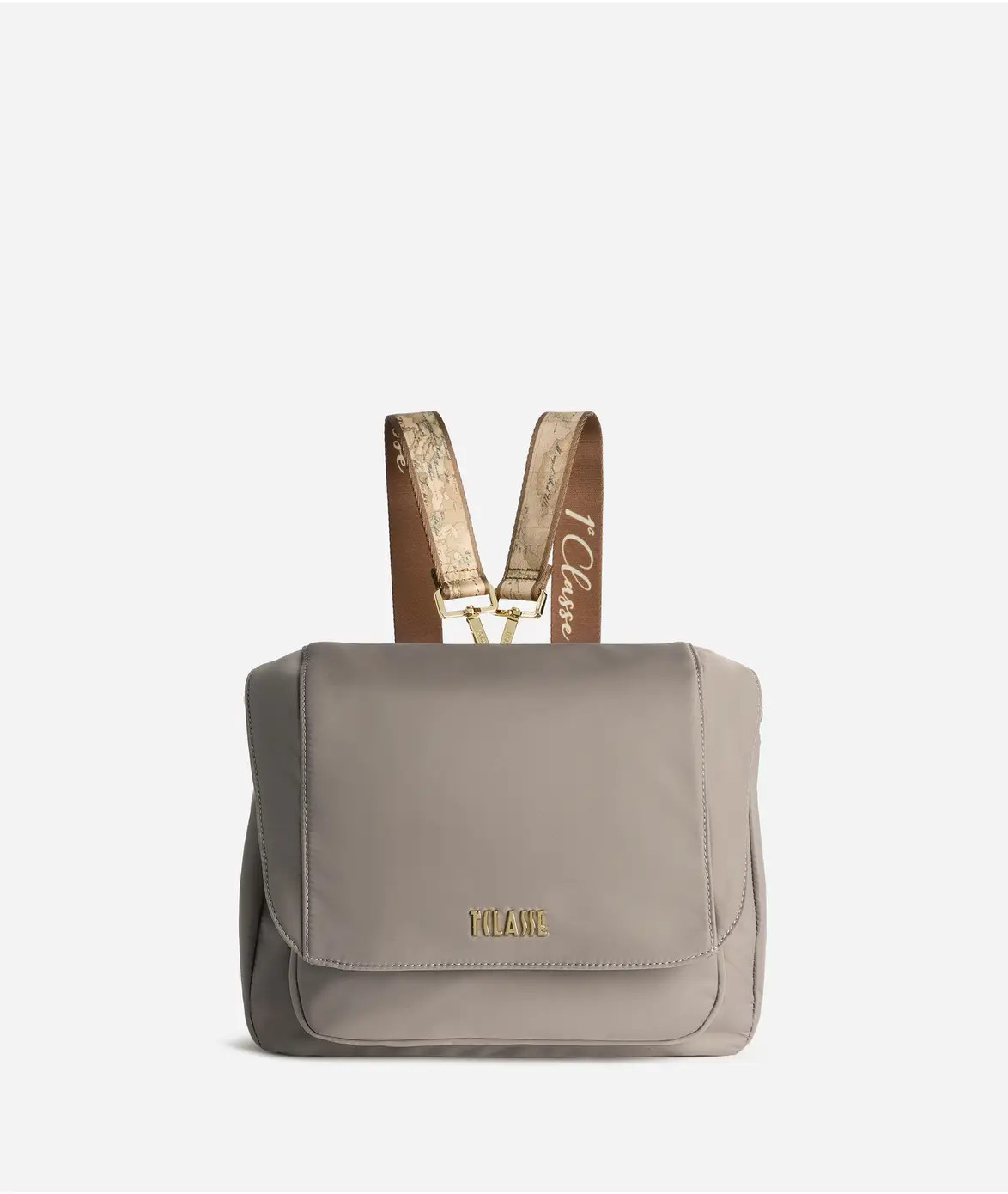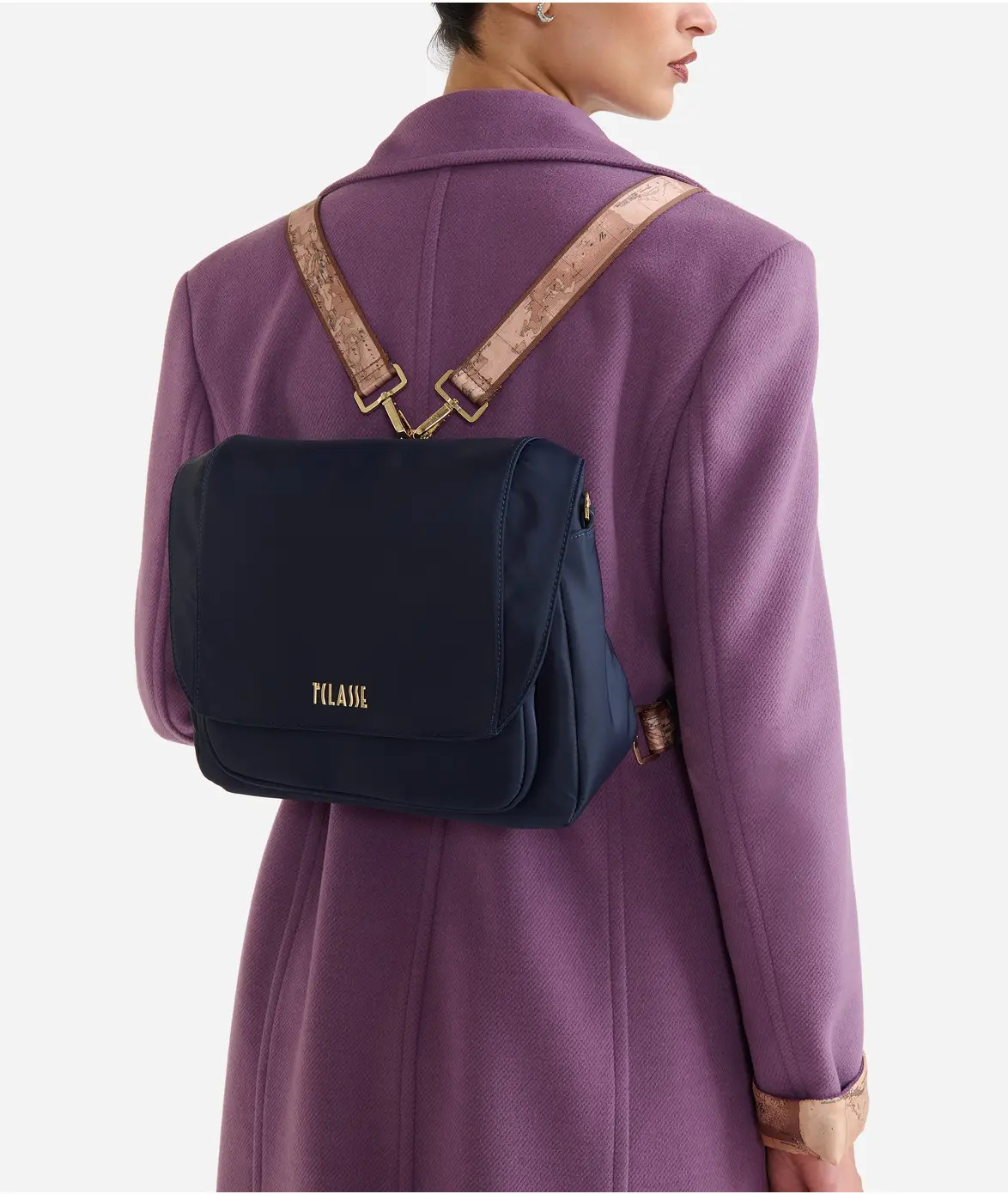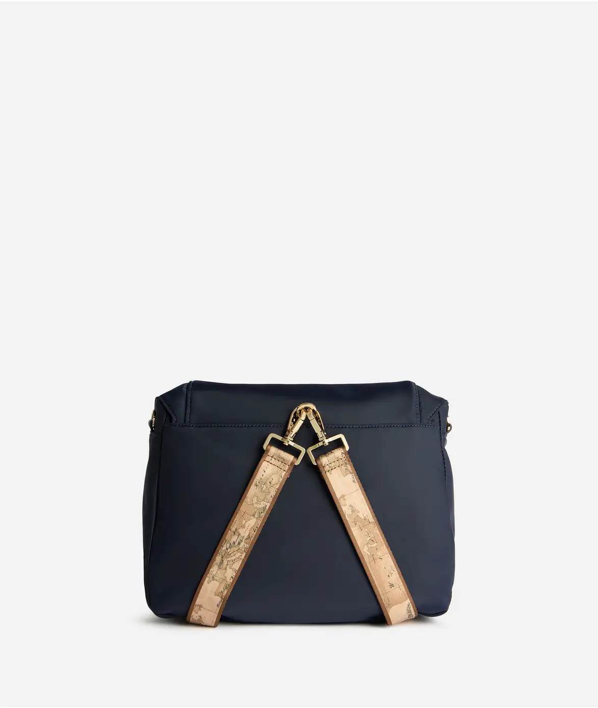 La linea Stormy Nylon introduce un nuovo modello di borsa crossbody in nylon riciclato, provvista di una tracolla extra per la portabilità a zaino. Entrambe le tracolle sono realizzate in nastro con stampa double-face con logo 1ᴬ Classe e mappa Geo Classic, rendendo inconfondibile il design. La chiusura con patta, illuminata dal logo 1ᴬ Classe, svela una tasca chiusa con zip e un interno capiente con ulteriori tasche interne.