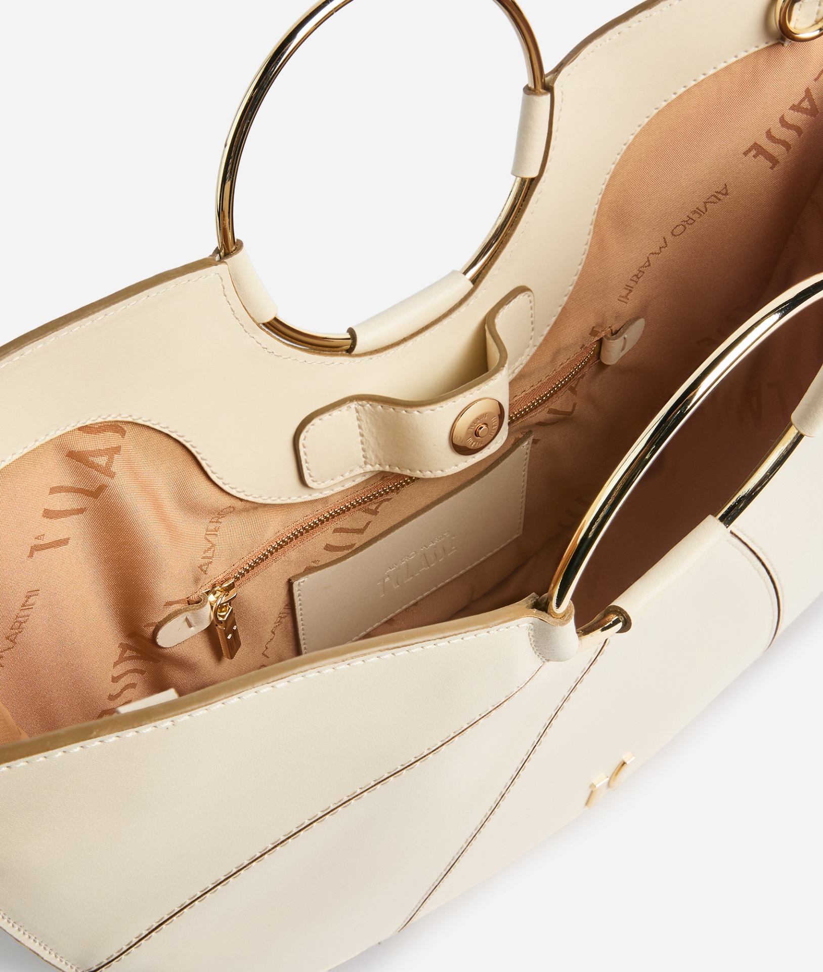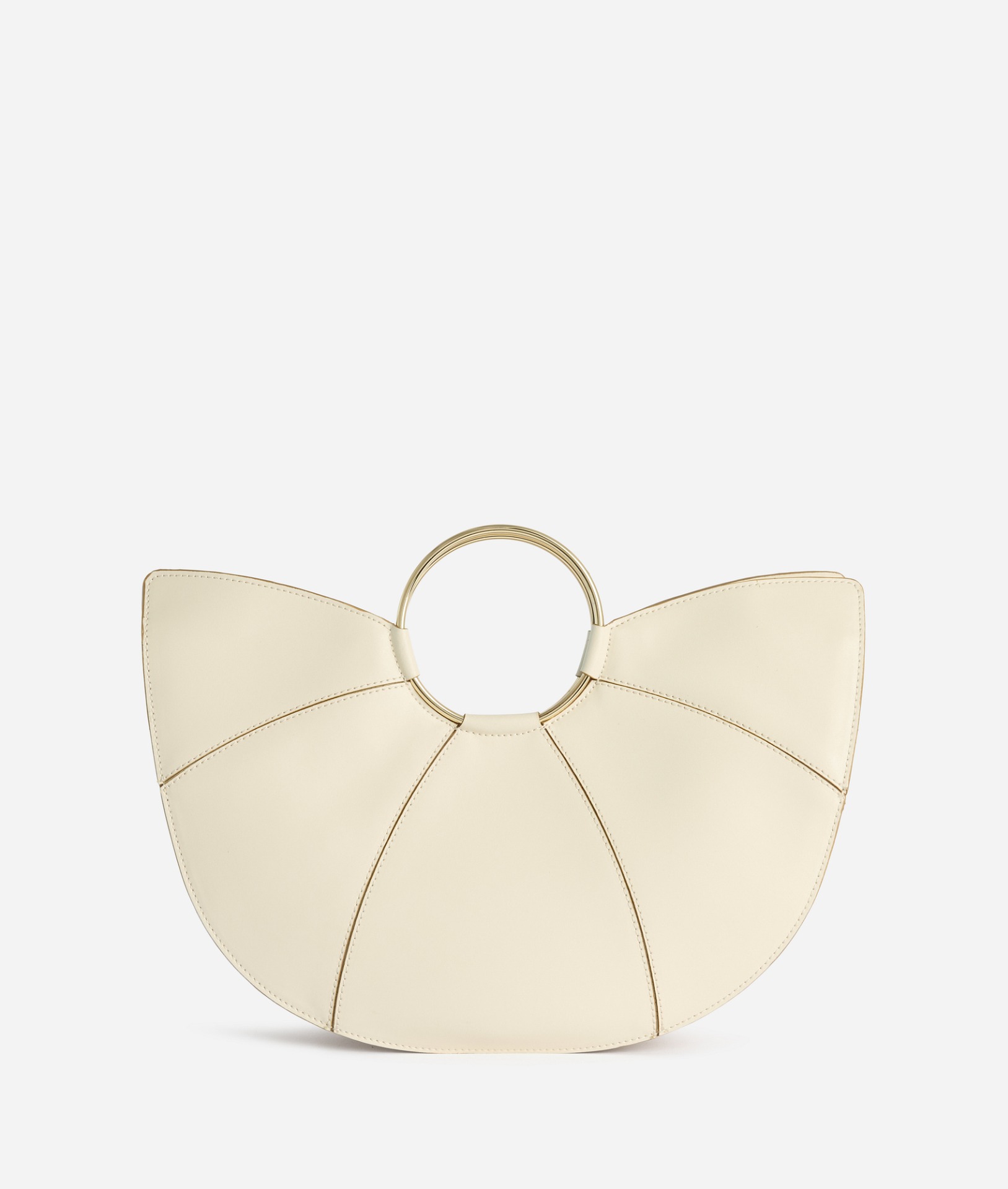 Realizzata in pelle liscia, la Vela Bag è il modello iconico della Collezione 'Viaggio in Australia'. I pannelli accostati e cuciti si aprono a ventaglio intorno ai manici a cerchio in oro chiaro: ne risulta una struttura precisa e lussuosa, con fianchi e sottoborsa realizzati in nappa stampa Geo Classic e il dettaglio delle coste a contrasto. La chiusura con magnete rivela un interno capiente, mentre la tracolla regolabile e rimovibile offre una doppia portabilità. Il logo 1C in oro chiaro sul fronte completa e illumina il modello